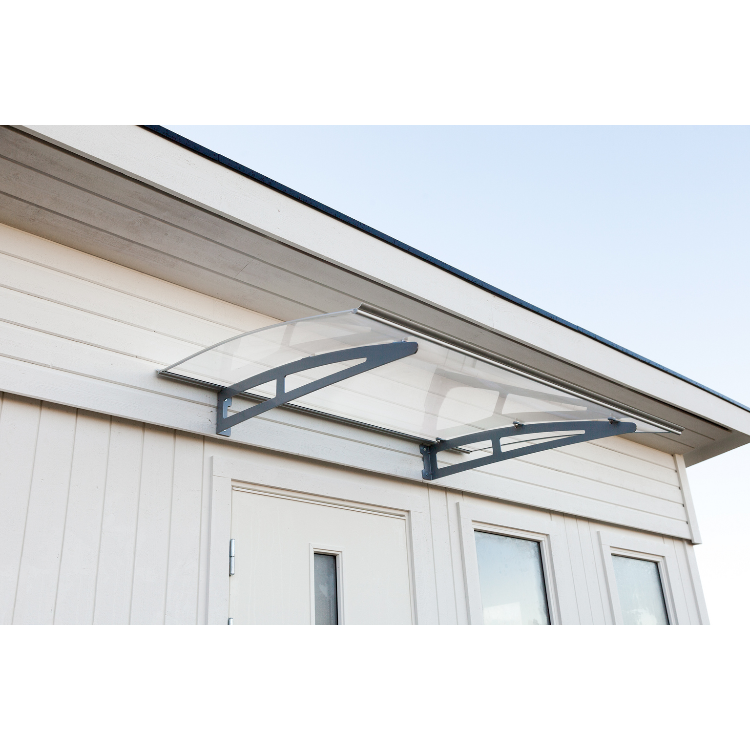 Entrétak i plast, polykarbonat, med aluminiumstag. Taket skyddar entrén och kan användas på ditt hus eller din friggebod.