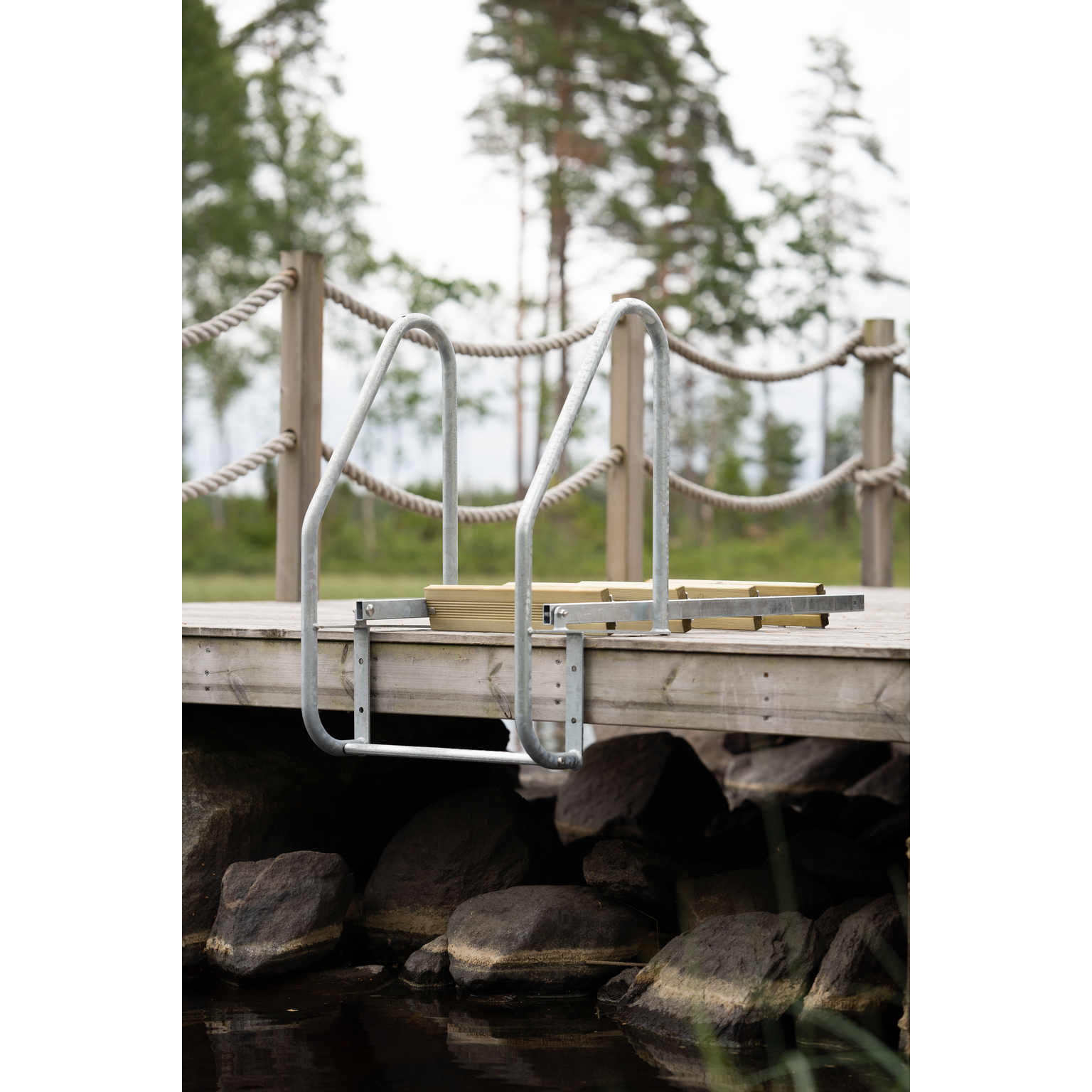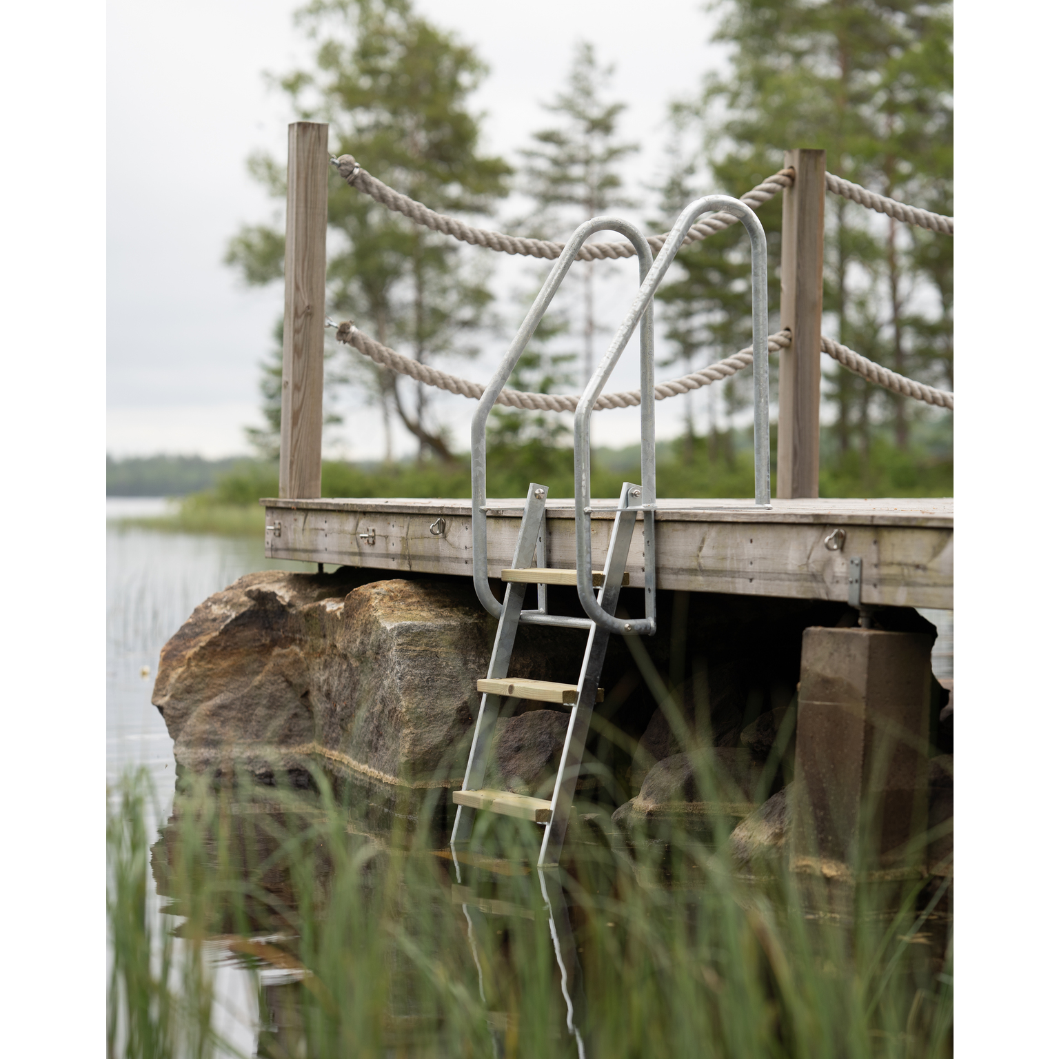 De impregnerade trästegen är godkända enligt Svenska Träskyddsföreningen och har 20-årig garanti för privatkonsumenter. Bryggstegen har en handledarhöjd på 670 mm och en fällbar funktion för enkel hantering. Perfekt på bryggan i stugan. • Svensktillverkad • Gjord av varmförzinkat stål • Impregnerade trästeg • Fällbar funktion • Handledarhöjd 670 mm • Kan kompletteras med förlängningsdel