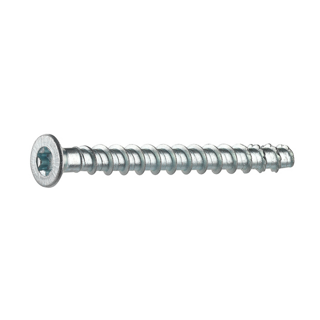 Betongskruv avsedd för montering av massiva trägolv, 25 mm för MMT5X50, mot betong. Inomhusskruv. Skruven är tillverkad av härdat kolstål med trubbig spets. TX25 grepp. Betonggänga. Blankförzinkad ytbehandling. Korrosivitetsklass C1. Förborras med 4 mm borr och skruvas direkt in i betongen. Rekommenderat varvtal: <400 varv/min.