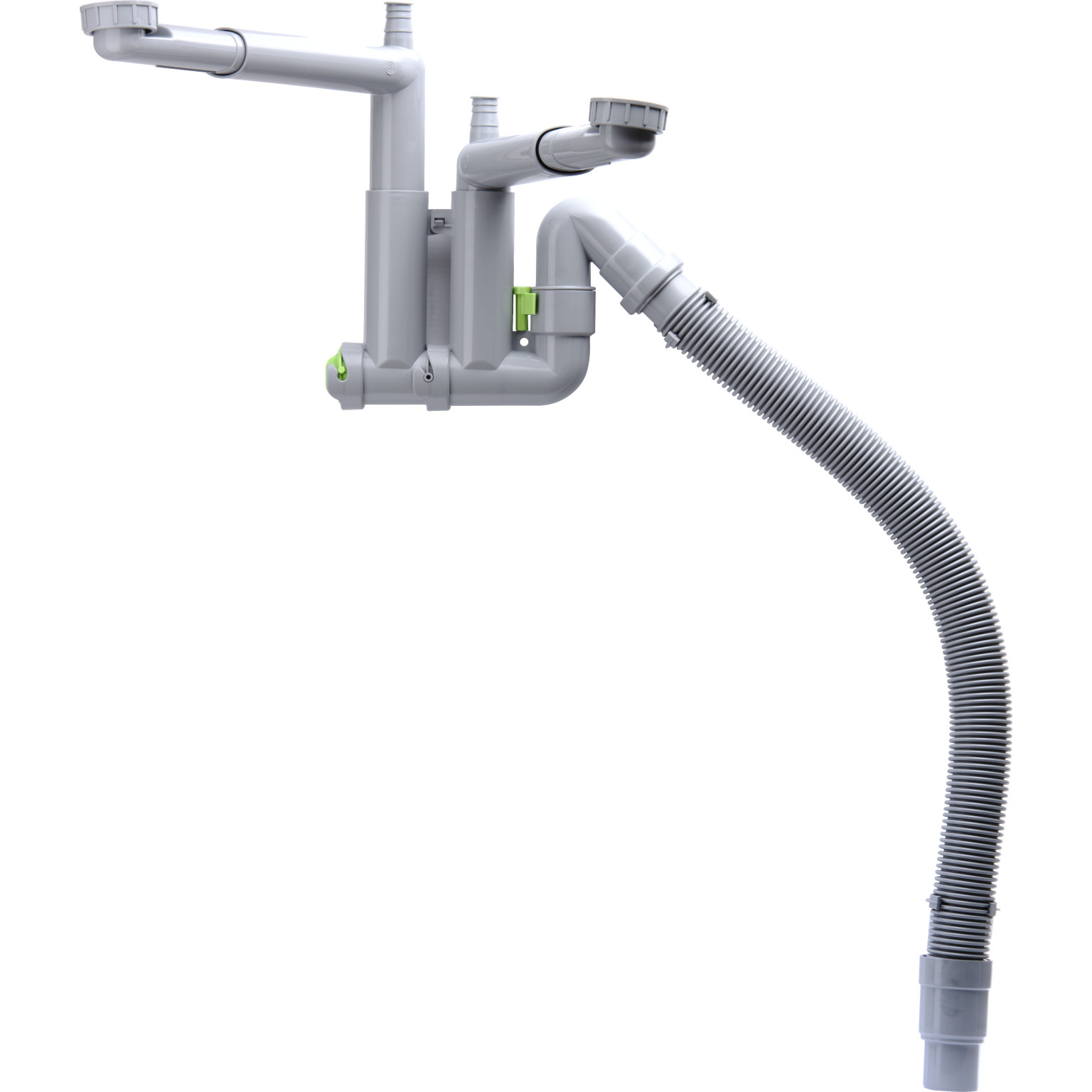 Smartlock vattenlås med stort flexibilitet för diskbänkarmed två utlopp. Med släta ytor och ovala rör förbättrar flödet och eliminerar avlagringar. Enkelt att installera på ett utrymmesbesparande sätt och rengörs lätt utan specialverktyg. Väggfäste ingår. Slangens längd 65 cm.
