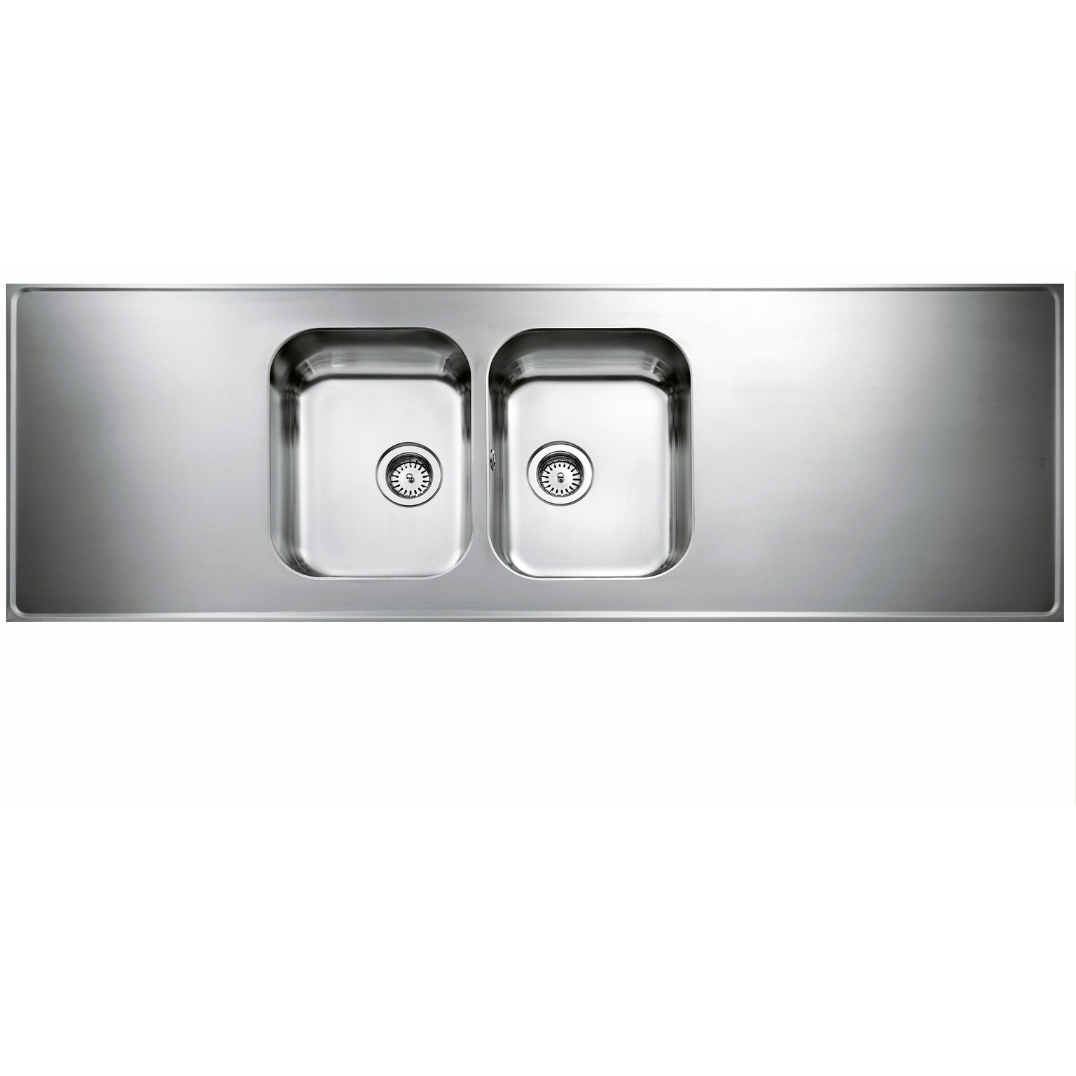 Vändbar heltäckande diskbänk med två stora lådor och avrinningsplan. Levereras med korgventiler, bräddavlopp och vattenlås. Toppmontering.