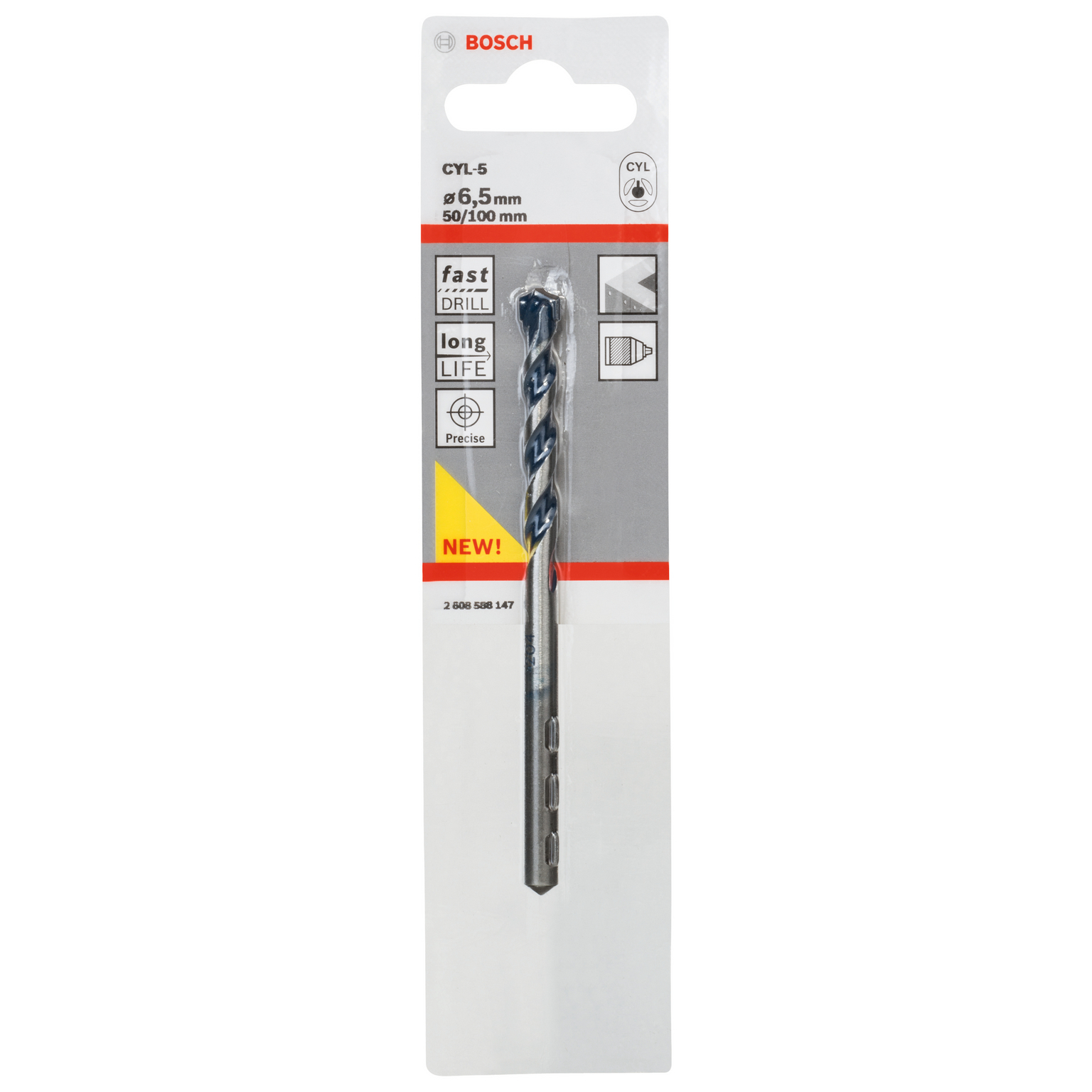Extra lång livslängd - CYL-5-borret ger extra lång livslängd vid borrning i betong och sten. Kombinationen av en karbidblandning som utvecklats av Bosch och diamantslipade skäreggar gör borret otroligt slitstarkt. Friktion på spiralen från materialet som borras minskas markant tack vare en tvåspårig vario-design med en kort, variabel lutning för effektiv dammborttagning och mindre slitage. Power Grip-skaftet från Bosch möjliggör 100 % kraftöverföring från maskinen till borret. På så sätt används kraften direkt för att borra, utan att någon kraft går förlorad, vilket minskar slitaget. Används vid borrning för beslag i betong, natursten och artificiell sten. Det kan användas med cylindriska skaft för alla slagborrmaskiner med och utan kabel. Som kvalitetsbevis har borret en kvalitetstestmärkning från PGM Masonry Drill Bit Association Board, vilket garanterar efterlevnad av tuffa toleranser, exakt borrade hål och stabil fästning av beslag. Cylindriskt skaft som passar till trebackschuck.