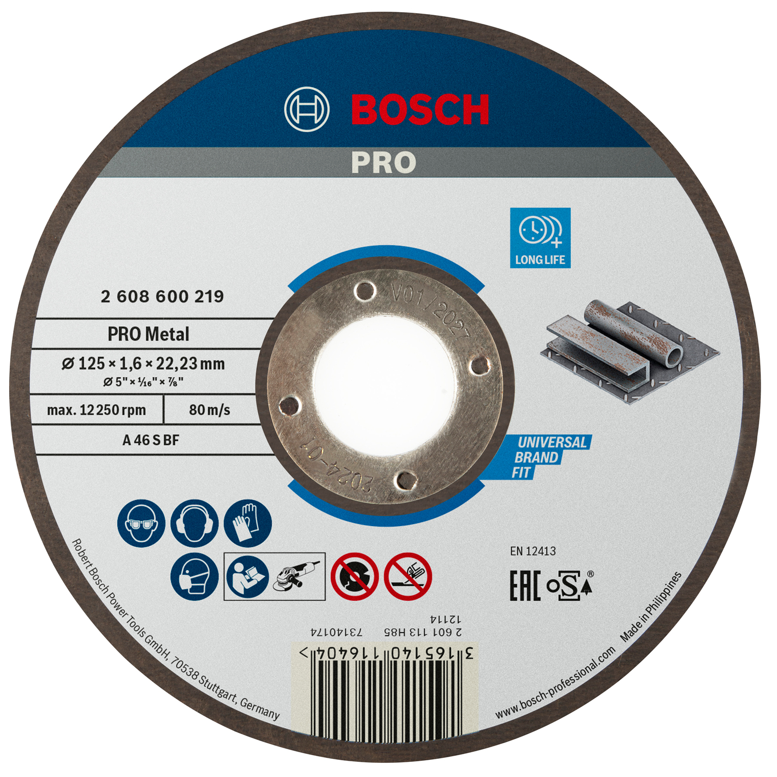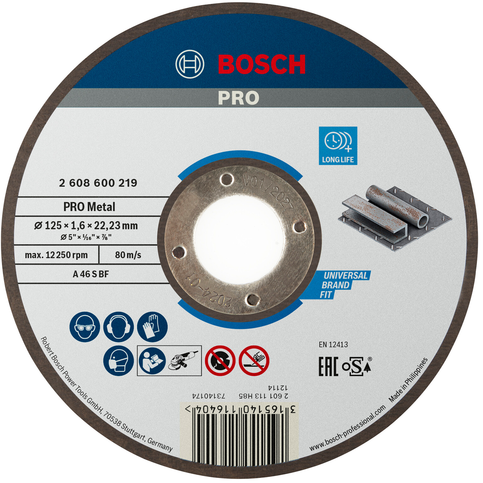 Dessutom säkerställer skivans precisionstillverkade glasfibernät hög stabilitet och säkerhet vid kapning. Bosch kapskivor uppfyller de högsta säkerhetskraven, till exempel EN 12413, FEPA och oSa. Med 22,23 mm hål för standardvinkelslipar med låsmutter.