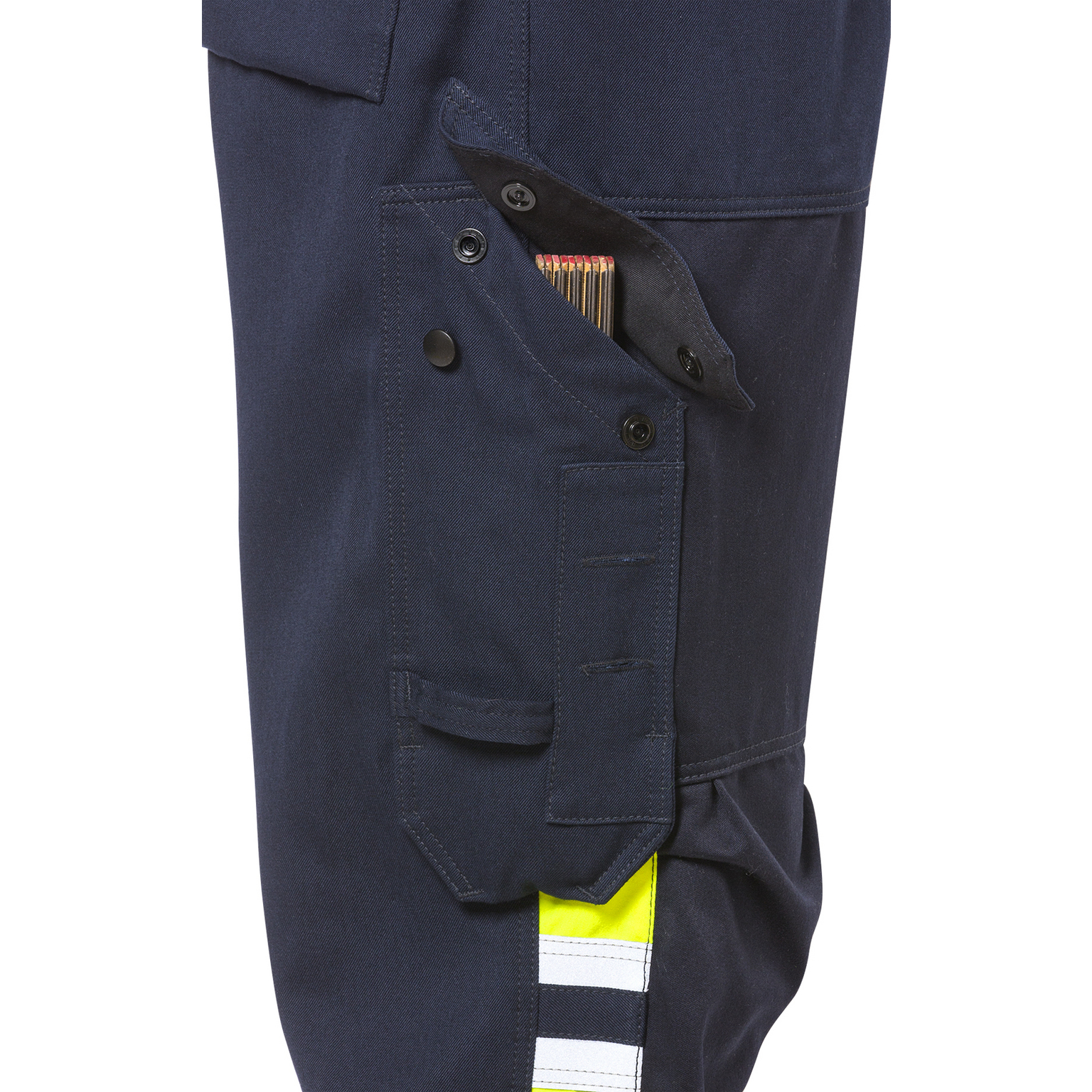 Inherent flamskydd / Förstärkning på framsida ben och i benslut / Metallfri / 2 framfickor / 2 förstärkta bakfickor med lock och kardborrelås / Dubbel förstärkt grensöm / Förstärkt rymlig tumstocksficka med lock och dold tryckknapp, pennficka samt knapp och hälla för kniv / Benficka med lock och dold tryckknapp / Knäfickor med öppning inifrån och reglerbar höjd av knäskydden / Extra benupplägg, kan förlängas 5 cm / Reflexdetaljer / Godkänd enligt EN 61482-1-2 klass 1, EN 61482-1-1 ATPV: 8,0 cal/cm² HAF: 78,2%, EN ISO 11612 A1 A2 B1 C1 D3 E3 F1, EN ISO 11611 A1 A2 klass 1 (se flam- och svetstabell för certifierade plaggkombinationer) och EN 14404 tillsammans med knäskydd 124292 (9200 KP) / Godkänd efter 50 tvättar / OEKO-TEX®-certifierad.