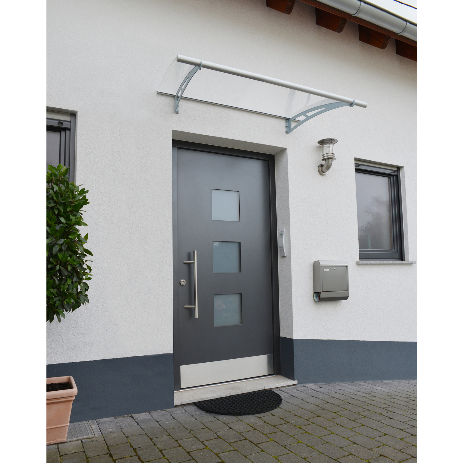 Dekorera din entré med en elegant taklösning. gop Stratus är ett underhållsfritt och lättmonterat entrétak av hög kvalitet som ger ett utmärkt skydd vid entréns ytterdörr, fönster, altandörr eller liknande och är motståndskraftigt mot vårt skandinaviska klimat året om. Takskivan består av en slagtålig 4 mm klar akrylskiva med 100% UV-skydd. Slitstarka, rostbeständiga aluminiumprofiler och robusta pulverlackerade galvaniserade stålkonsoler håller takskivan på plats. Effektiv ränna i takets framkant leder regnvatten åt sidan. Dold gummitätning i takets bakkant tätar mot vägg. Entrétaket finns i flera bredder.