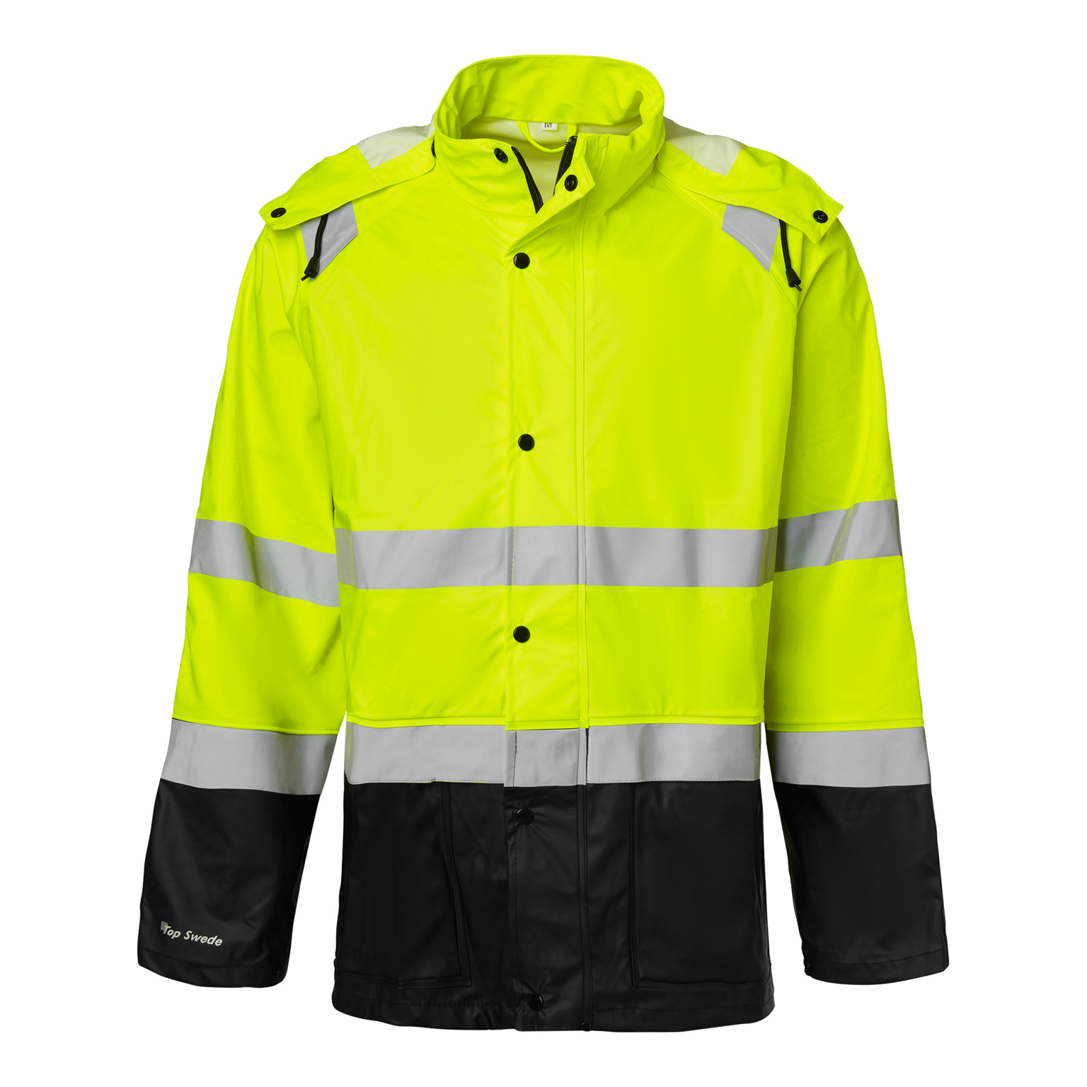Regnjacka varsel i stretchmaterial med svetsade sömmar. Dragkedja med slå och tryckknappar. Dold ID-kortsficka. Avtagbar huva med snodd. Två framfickor med lock. Innerficka. Telefonficka. Dragsko i nederkant och reglerbart ärmslut. Längd 80 cm. EN ISO 20471 klass 3, EN 343 klass 3/1