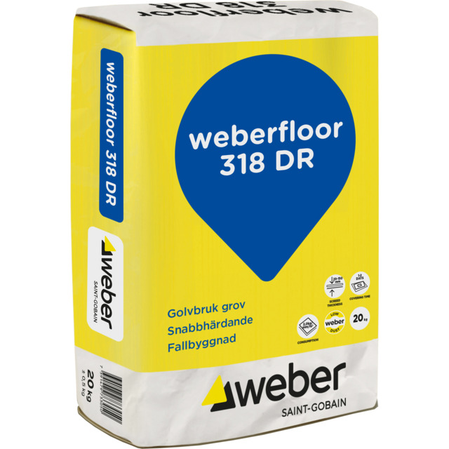 weberfloor 318 snabbslipsats grov DR är ett snabbhärdande golvbruk som ger en yta med en något grövre struktur än avjämningsmassor. Ytan bör primas och finspacklas före mattläggning. Lämpligt för användning i bostäder, våtrum och kontor inomhus där särskilda krav ställs på snabb ythållfasthet för tidig mattläggning.