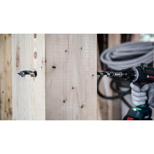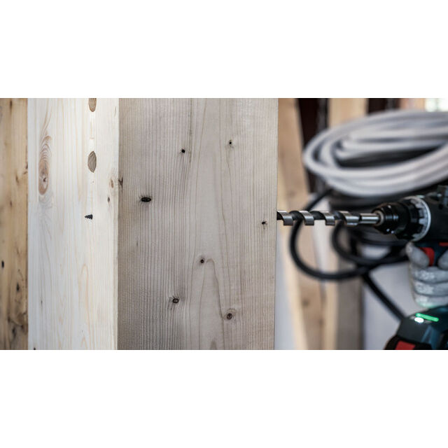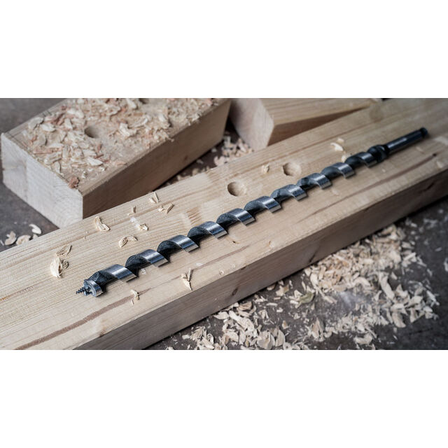 Snabb, exakt borrning - Spiralborret passar perfekt för snabb, exakt borrning av genomgående hål, förborrning för sparrspik och djupa träpluggshål. Det tåliga borrhuvudet med självindragande spiralspets drar igenom hela borrlängden för snabb och smidig precisionsborrning. Rak borrning och stor spåntransport, plus högre hastighet tack vare borrets optimerade lågfriktionsspiral med massiv kärna. Dess optimerade förskär och precisionsslipade huvudskär ger rena exakta hål. Det passar perfekt för byggföretag, byggnadssnickare och takläggare, och lämpar sig för mjukt och hårt trä Borret har ett sexkantsskaft och fungerar till alla skruvdragare med 13 mm chuck. Sexkantsskaft för maximal kraftöverföring hos standard trebacksborr och sexkantiga skruvdragarchuckar.