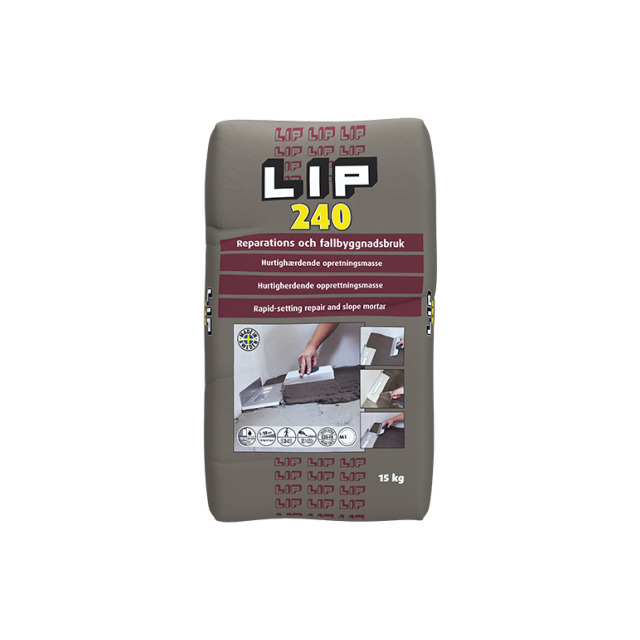 LIP 240 Reparations- och fallbyggnadsbruk Cementbaserad spackelmassa för tjocka lager. LIP 240 Reparations- och fallbyggnadsbruk är en cementbaserad och flexibel, slitstark spackelmassa, som används till reparation, utjämning och utspackling av råbetong, cement- och anhydritspackel gjutasfalt, terrazzogolv, kermik, kakel- och klinkerbeläggningar, natursten, gasbetong, lättbetong m.m. samt lagning av hål i väggar och trappsteg. Lämpligt tillsammans med golvvärmesystem.