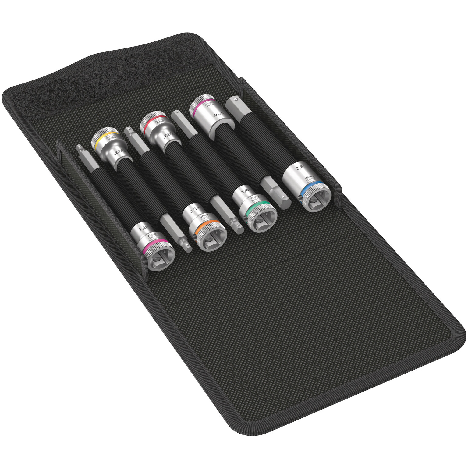 Bitshylssats i krom-vanadin-stål med 3/8"-fattning och hållarfunktion för insexskruvar. Färgkodning för enkelt val av rätt verktyg. Läs mer