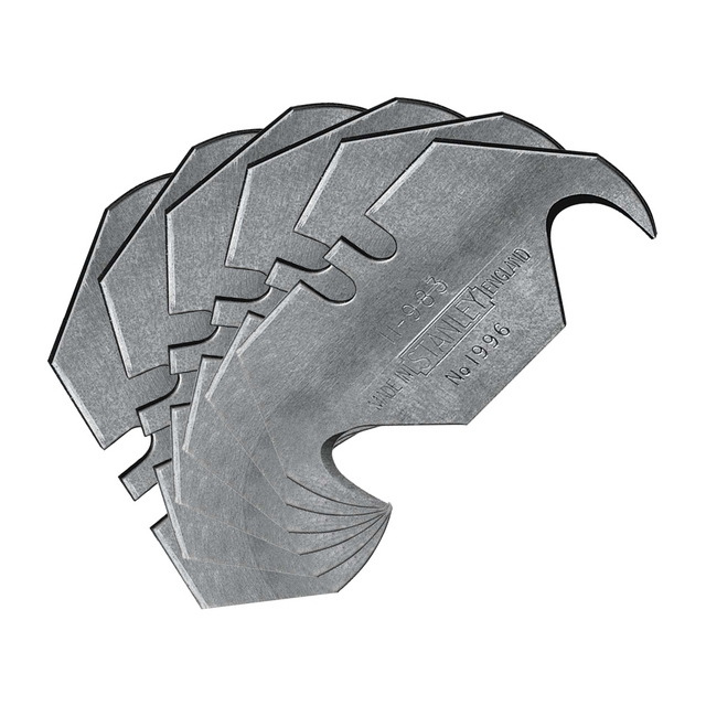 Finslipat krokblad med spets för penetrering och skärning av foliematerial. Bladen passar alla Stanley-knivar. Kan levereras i enheter om 5 på ett kort, 10 enheter i en dispenser eller 100 enheter i bulk.. Även utmärkt för plastfolie som används inom förpackningsindustrin. Finslipat krokblad med spets för penetrering av framför allt golv-, tak- och plastbeläggningar.