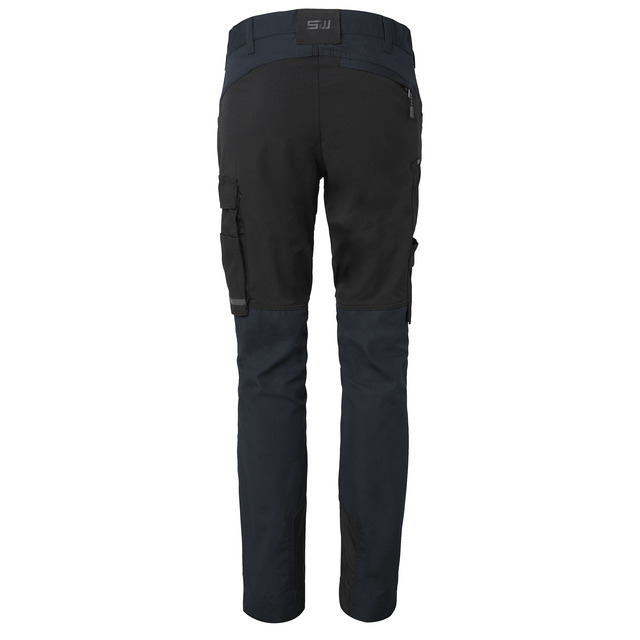 Arbetsbyxa i modern dampassform av lätt och slitstarkt material med stretchfunktion för ökad rörlighet på utvalda partier. Många rymliga och praktiska fickor, tumstocksficka och benficka för mobil samt knäskyddsfickor med två nivåer och extra förstärkningar på utsatta delar. Reflexdetalj på vänster ben. Förlängningsmöjlighet (5 cm) i benavslut.