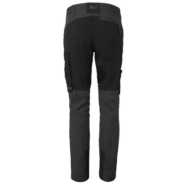Arbetsbyxa i modern dampassform av lätt och slitstarkt material med stretchfunktion för ökad rörlighet på utvalda partier. Många rymliga och praktiska fickor, tumstocksficka och benficka för mobil samt knäskyddsfickor med två nivåer och extra förstärkningar på utsatta delar. Reflexdetalj på vänster ben. Förlängningsmöjlighet (5 cm) i benavslut.