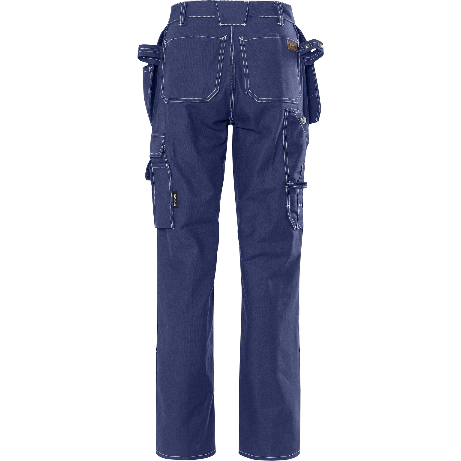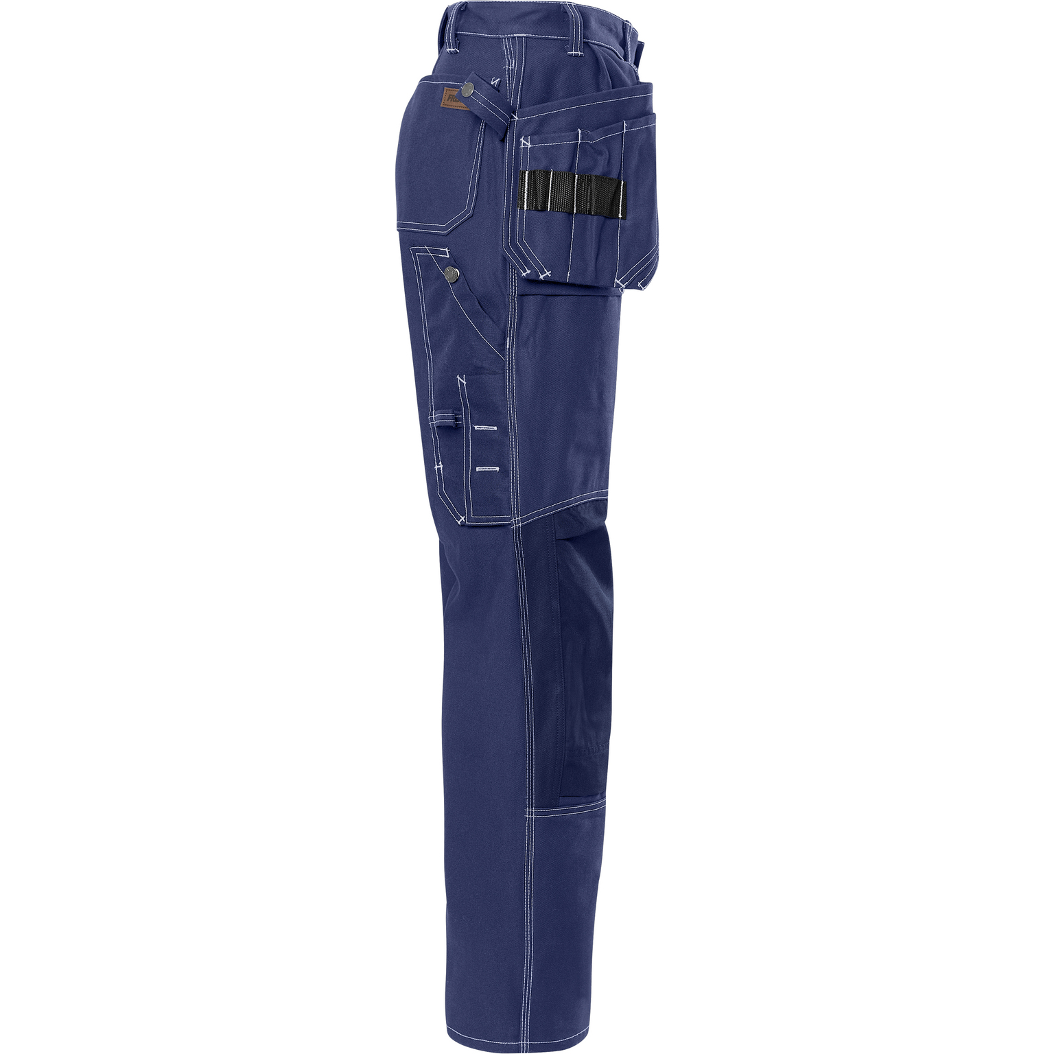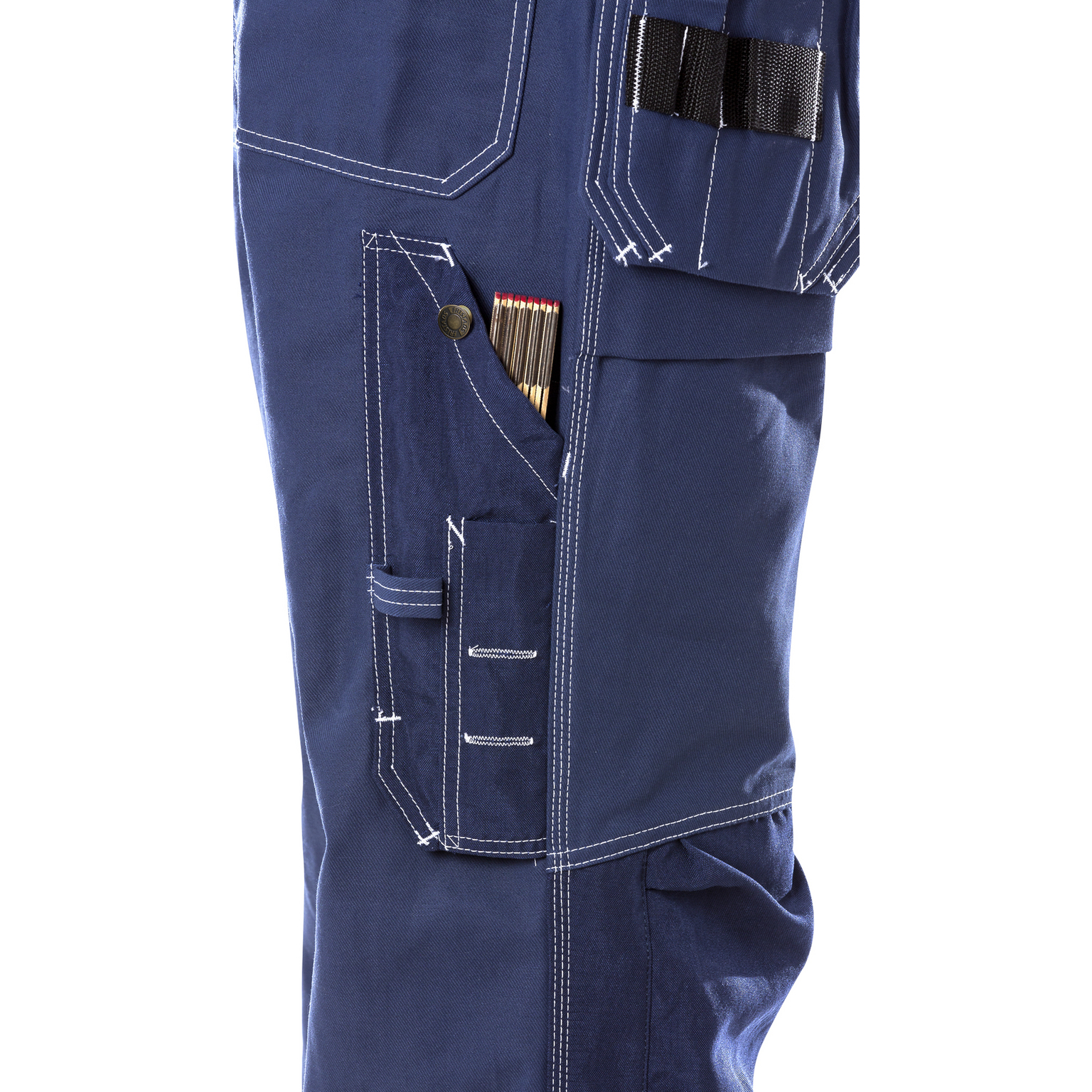 FAS® bomull / 2 löst hängande CORDURA®-förstärkta undanstoppningsbara spikfickor – den ena med extra ficka, den andra med 3 mindre fickor och verktygshällor / 2 rymliga fram- och bakfickor / D-ring / 2 hammarhankar, varav en justerbar / Tumstocksficka med pennficka samt knapp och hälla för kniv / Benficka med telefonficka och dold ID-kortsficka / Knäfickor av CORDURA®, öppning utifrån och reglerbar höjd av knäskydden / Godkänd enligt EN 14404 tillsammans med knäskydd 124292 (9200 KP) / OEKO-TEX® certifierad.