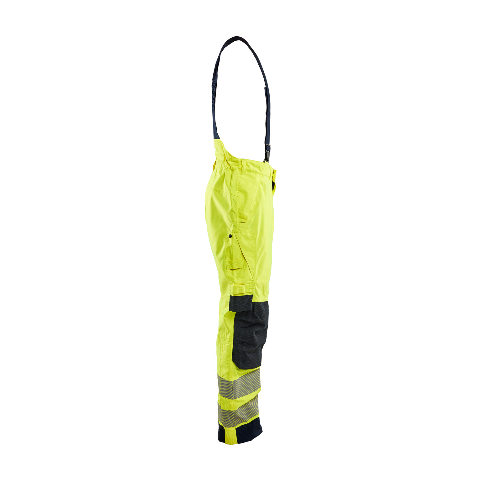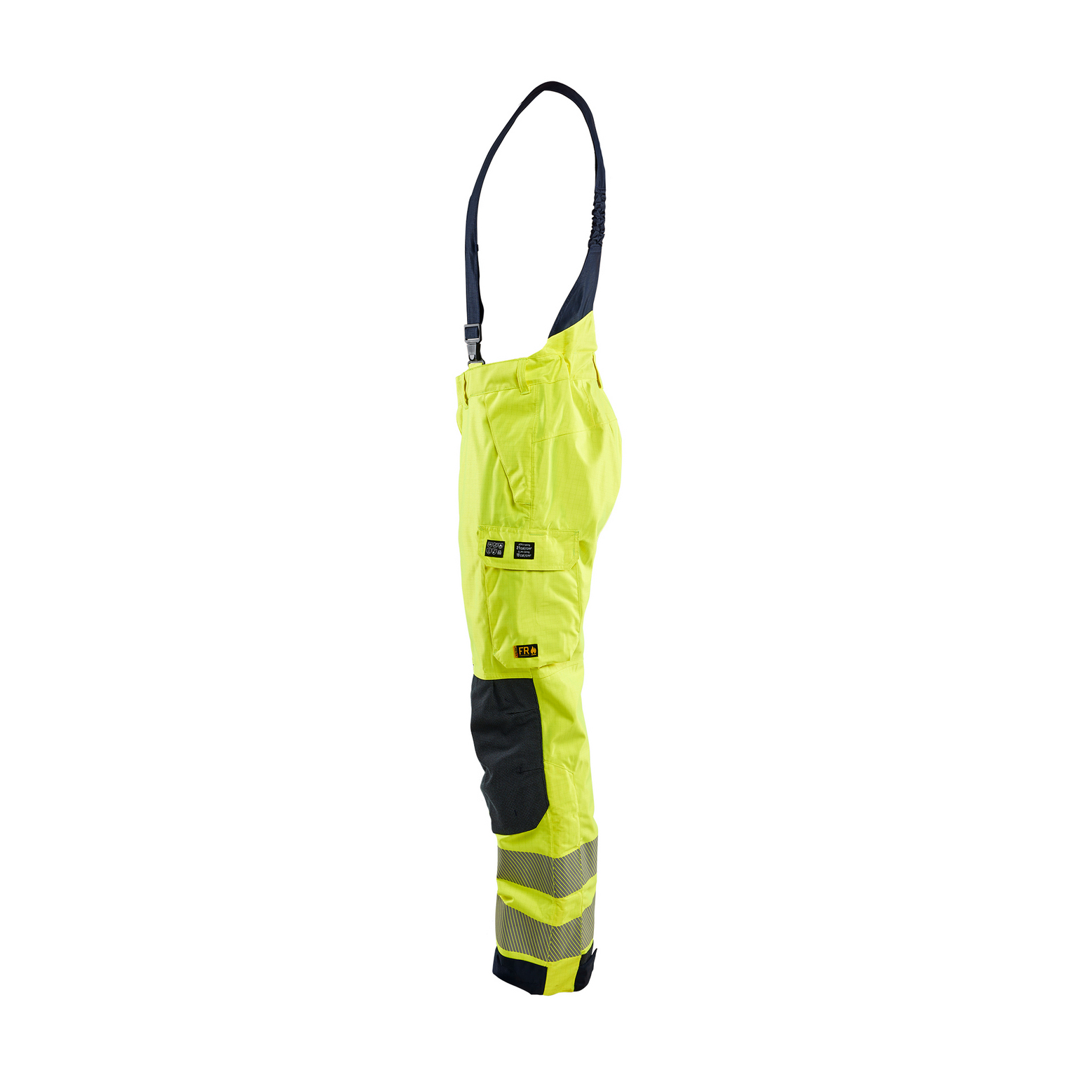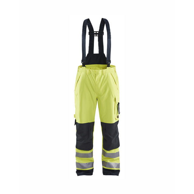 Skalbyxa i varselfärg med inbyggt flamskydd. Vind- och vattentät för arbete i väderutsatta miljöer. Avtagbara hängslen och förstärkta knäskyddsfickor.