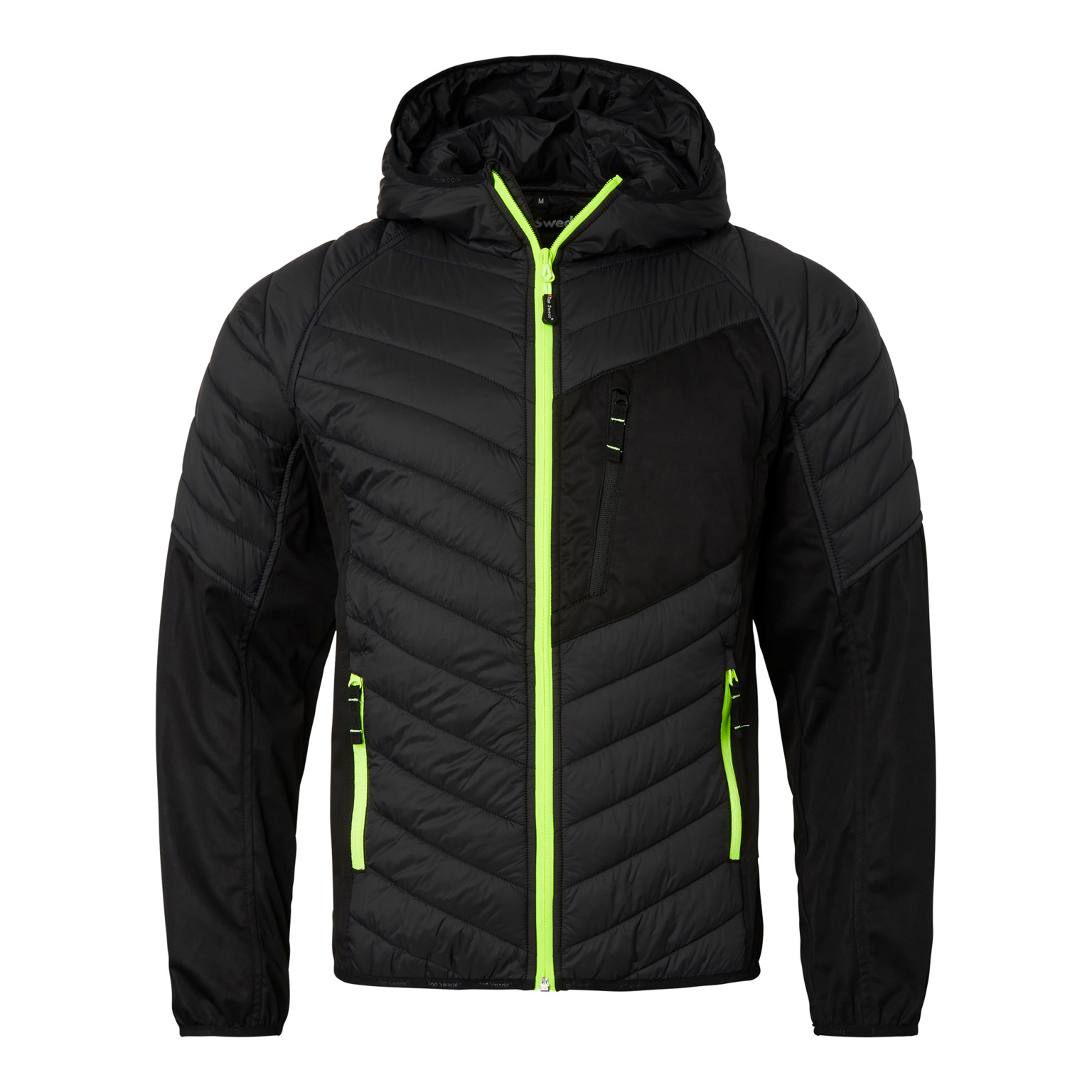 Modern quiltad lättviktsjacka med huva och dunkänsla. Stretchpaneler i softshell på sidorna, under armar och underarmar. Två framfickor och en bröstficka med blixtlås. Elastisk mudd i ärmslut och nederkant. Perfekt för arbete i varierande m Läs mer