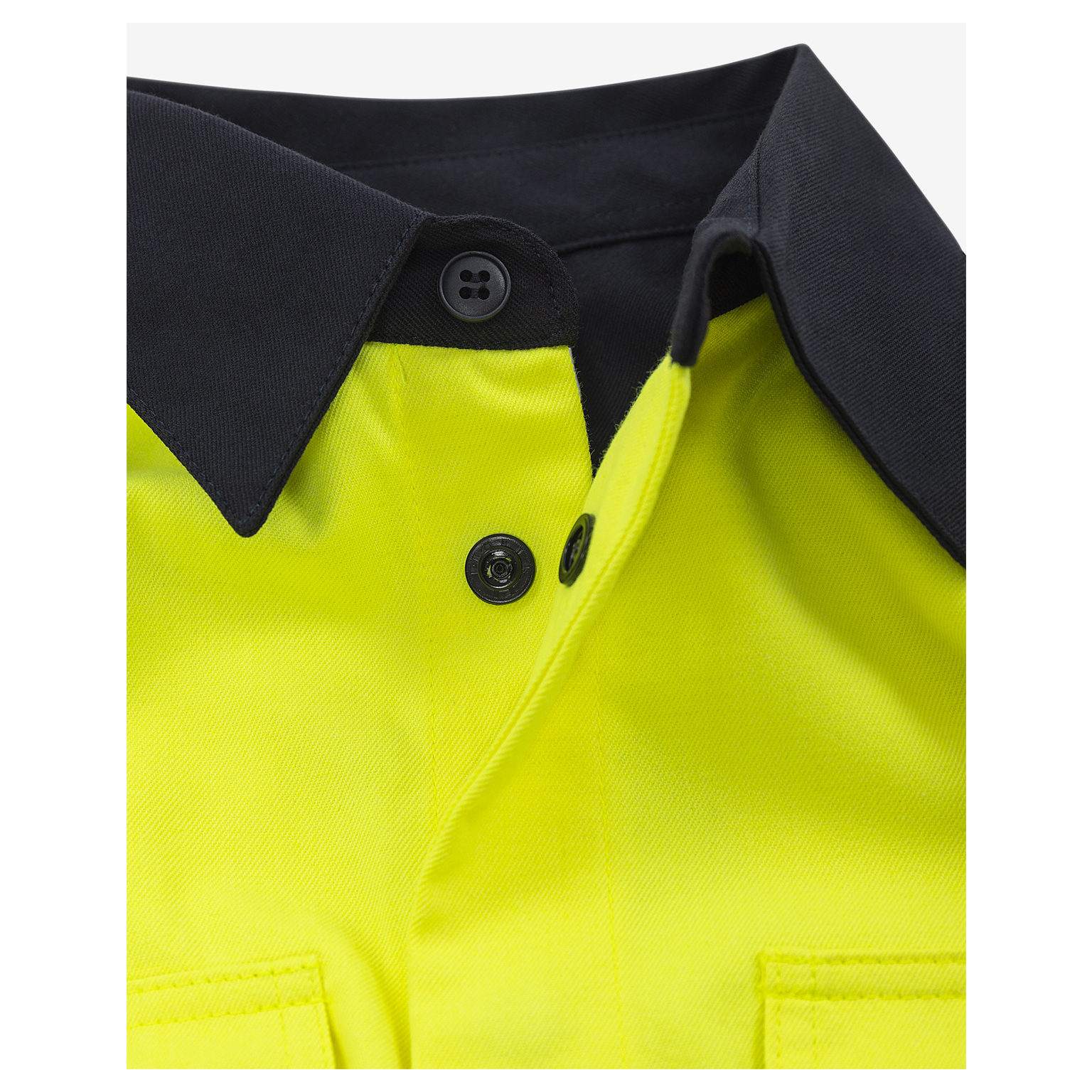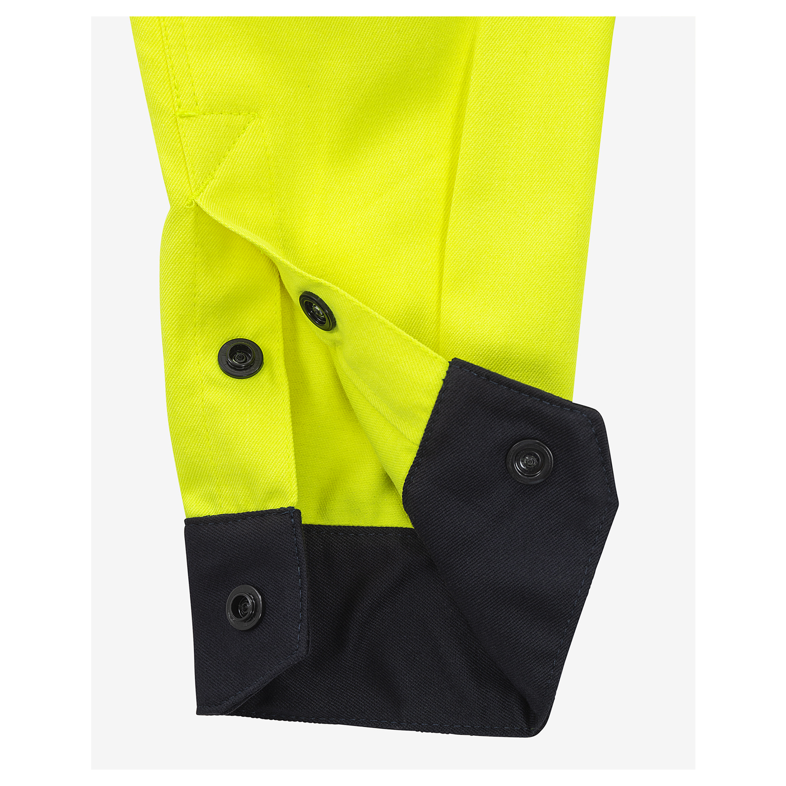 Skjortan är designad med inbyggt flamskydd och är helt metallfri, vilket gör den lämplig för ATEX-miljöer. Den har en frontslå med dolda tryckknappar och två bröstfickor med lock, varav en är utrustad med en pennhållare. Ärmsluten är försedda med dolda tryckknappar för en smidig och säker passform.