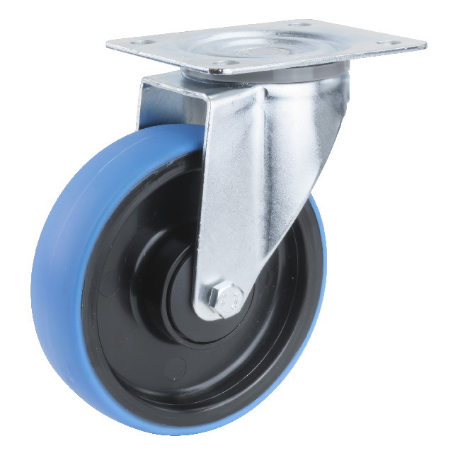 Pressad förzinkad plåtbygel med fästplatta. Svängkrans med dubbla kulrader, sammanfogad med en centrumnit. Bromsade länkhjul låser hjul och vridning samtidigt.Termoplastiskt Polyuretanhjul med nylonnav.