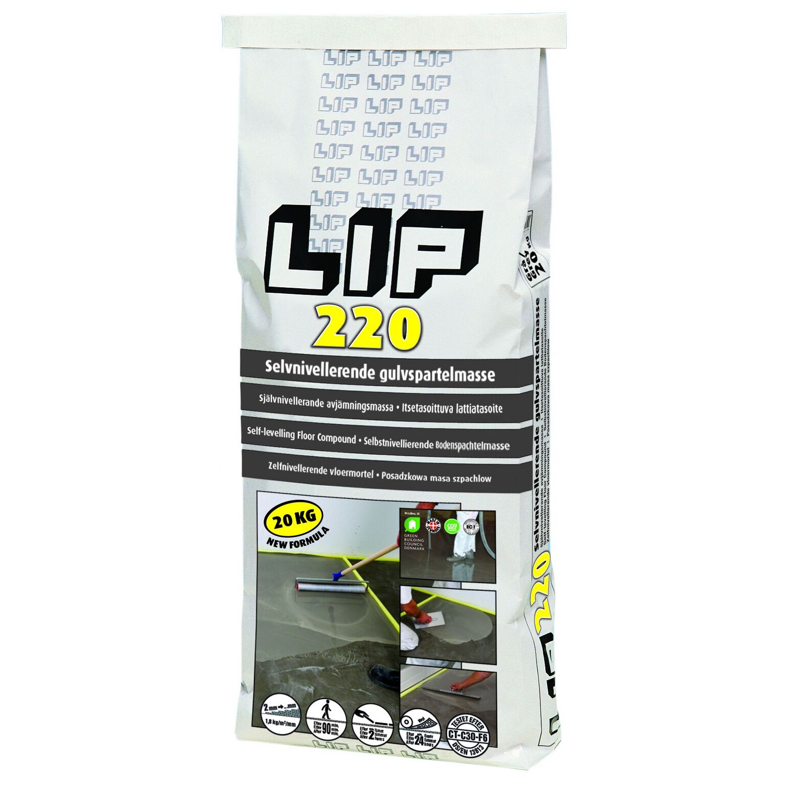 LIP 220 Avjämningsmassa för utjämning och spackling av betong, natursten, kakel, klinker, ingjutning av värmekablar mm. Cementbaserad, spänningsfattig, plastförstärkt, självnivellerande och pumpbar. För inomhusbruk.