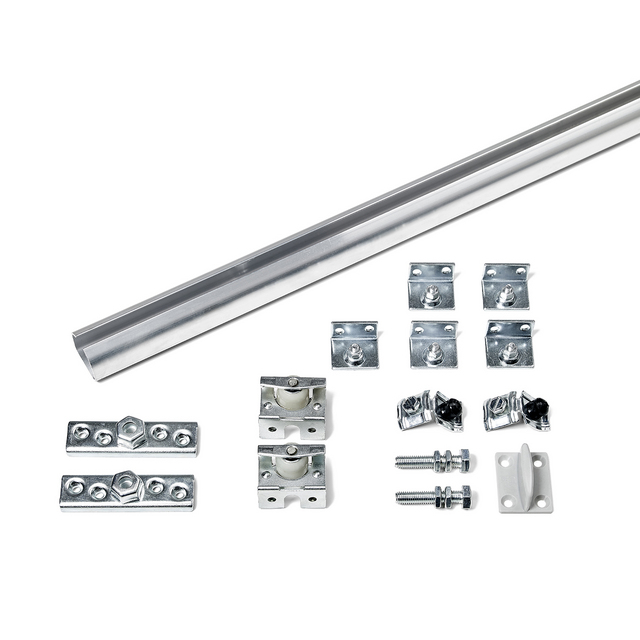 Skjutdörrsbeslag av aluminium för dörrbredd 63-120 cm. För dörrar med vikt upp till 40 kg. Kan användas för både tak- och väggmontering. Innehåll: 2 m aluminium skena (1 st), skjutdörrsrullar (2 st), stoppbeslag (2 st), bottenklack (1 st), bärvinklar (5 st), träskruvar samt monteringsanvisning. Hjul med både kullager och glidlager.