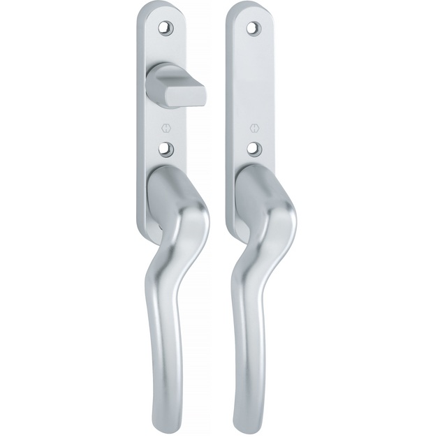 Det invändiga handtaget är utrustat med ett vred, vilket möjliggör enkel låsning och upplåsning från insidan. Detta kan vara särskilt användbart i situationer där snabb och enkel kontroll över dörrens låsstatus är önskvärd. Det utvändiga handtaget ger en bekväm och stabil greppyta för att öppna och stänga dörren från utsidan.
