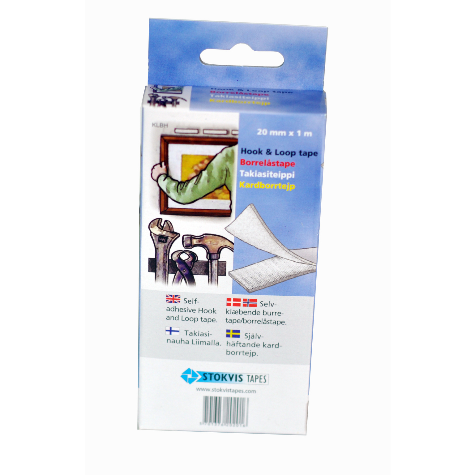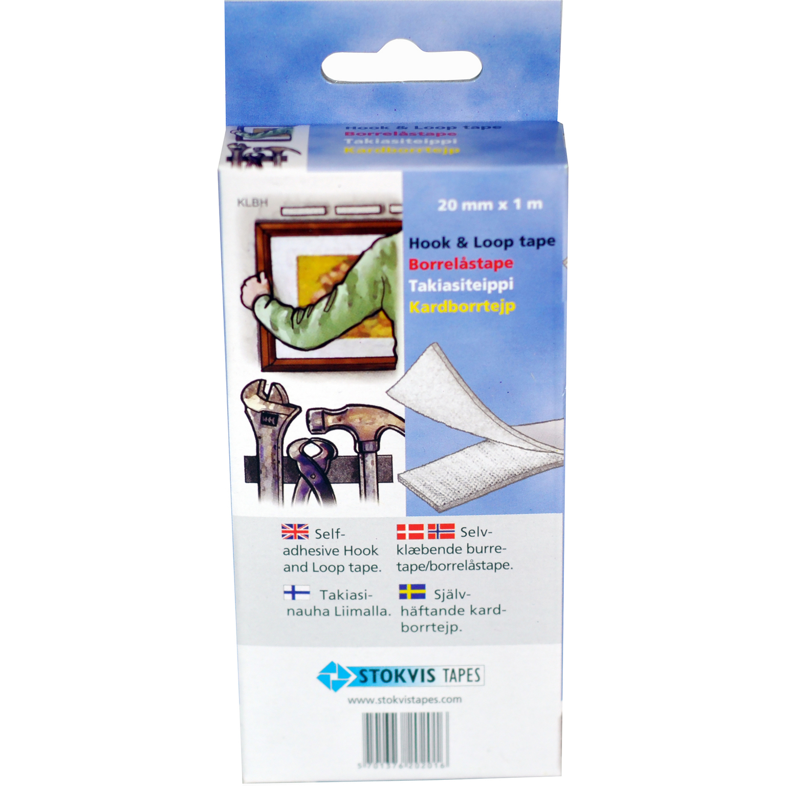 Kardborrtejp, självhäftande. Möjliggör enkel ”hänga-upp / ta-bort – funktion”. Snabbt att ta ner/hänga tillbaks med kardborrfunktion. Oändliga möjligheter att fixera stort som smått. Kardborrband med starkt häftämne 20 mm x 1 m