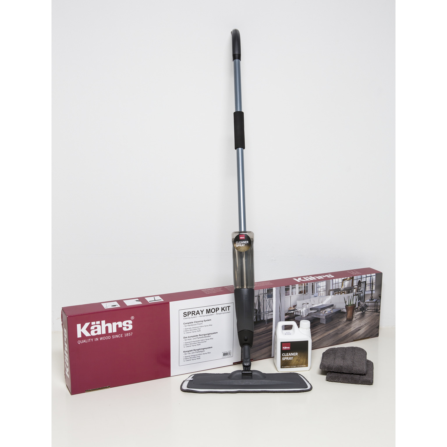 Kährs spraymoppkit med spraymopp, färdigblandad Kährs Cleaner, 3 st micromoppar med kardborrefästning. För samtliga golvytor.