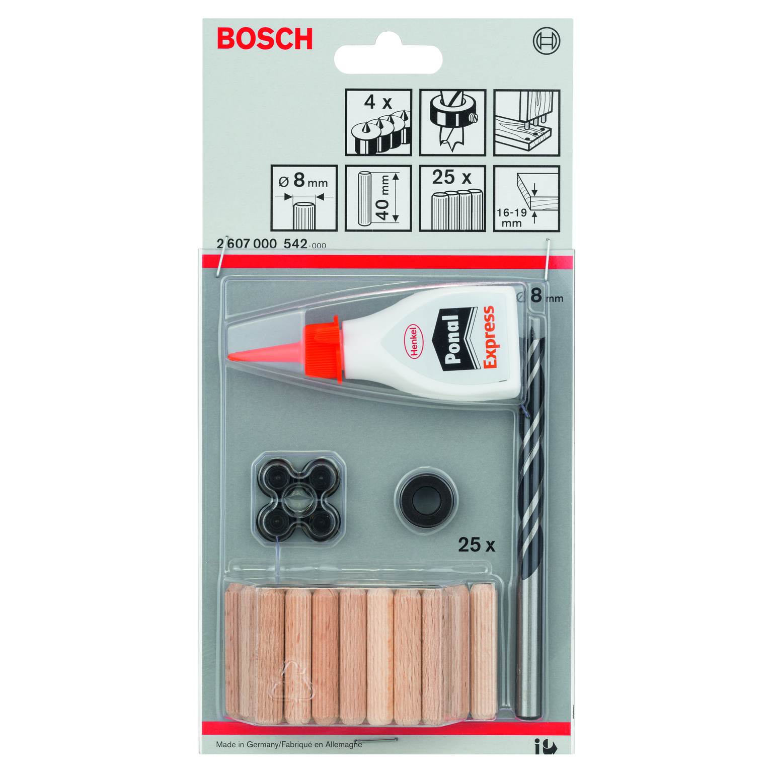 Fästa pluggar i trä - Träpluggsatsen är en praktisk lösning för att fästa pluggar i trä. Den levereras komplett med träspiralborr, djupanslag, pluggmarkörer, räfflade träpluggar och trälim. Satsen är klar att använda och innehåller alla tillbehör som behövs för att arbeta effektivt i mjukt och hårt trä. Träspiralborret har en centreringsspets och hörnfräs för borra hål med rena snitt och jämna väggar i borrade hål. Cylindriskt skaft som passar till trebackschuck.