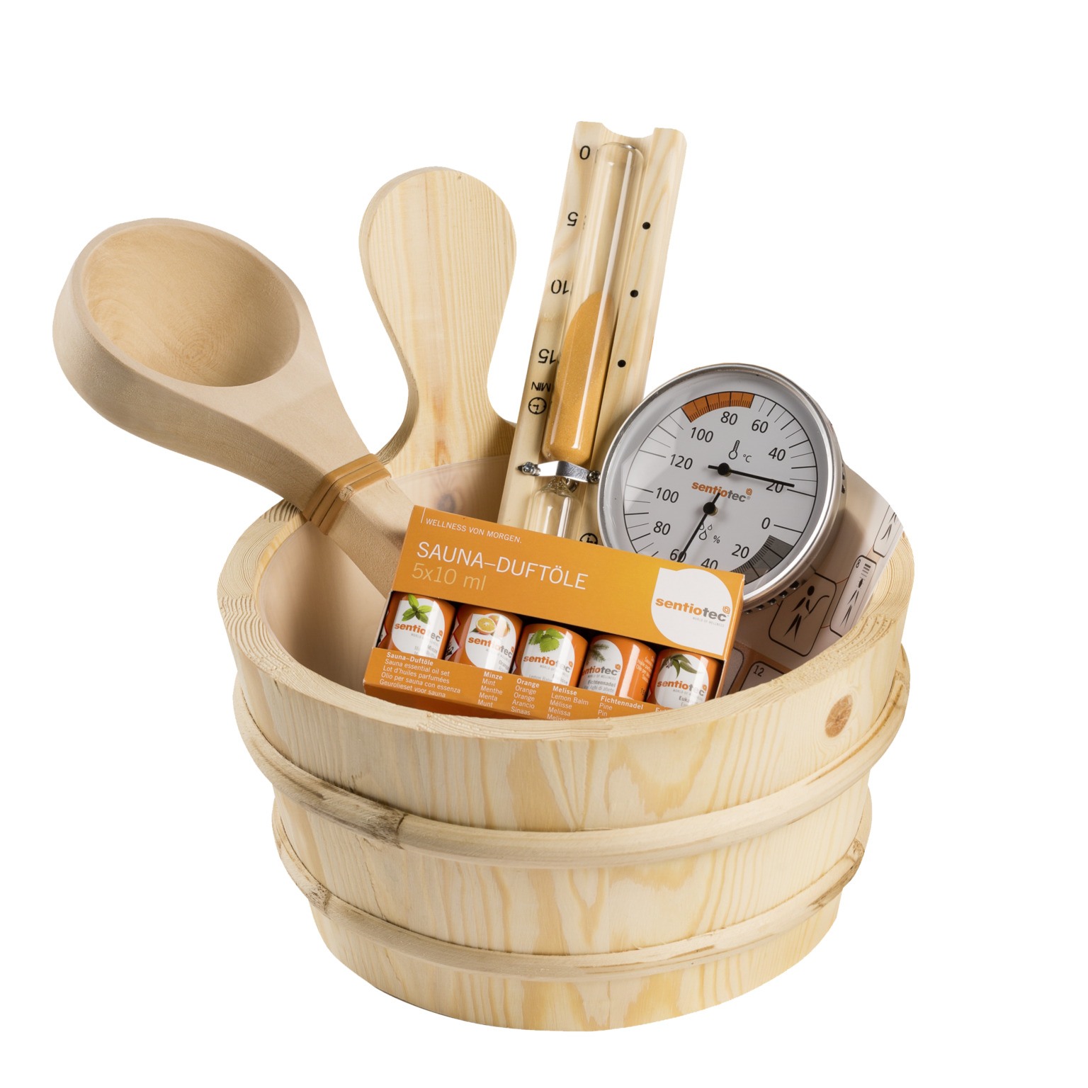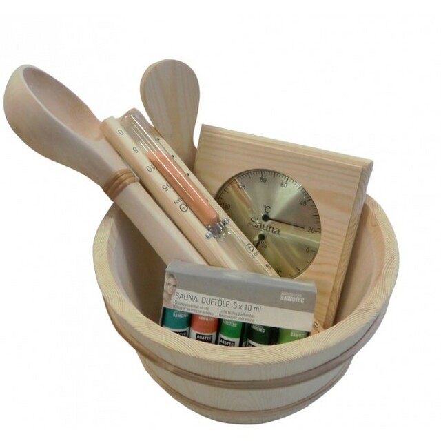 Produktinformation Startpaket innehållande 4 liters bastutäva med träskopa. Termo- och hygrometerplatta, 15 minuters sandur och 5 st 10 ml bastudofter innehållande apelsin, mint, citronmeliss, tall och eucalyptus.
