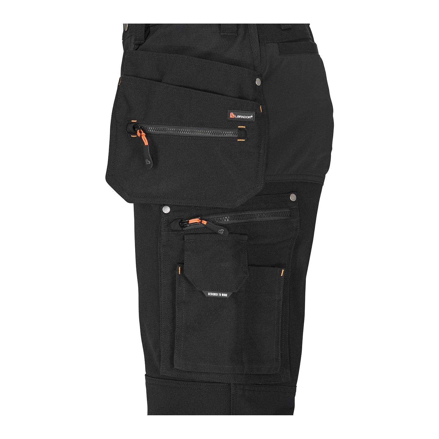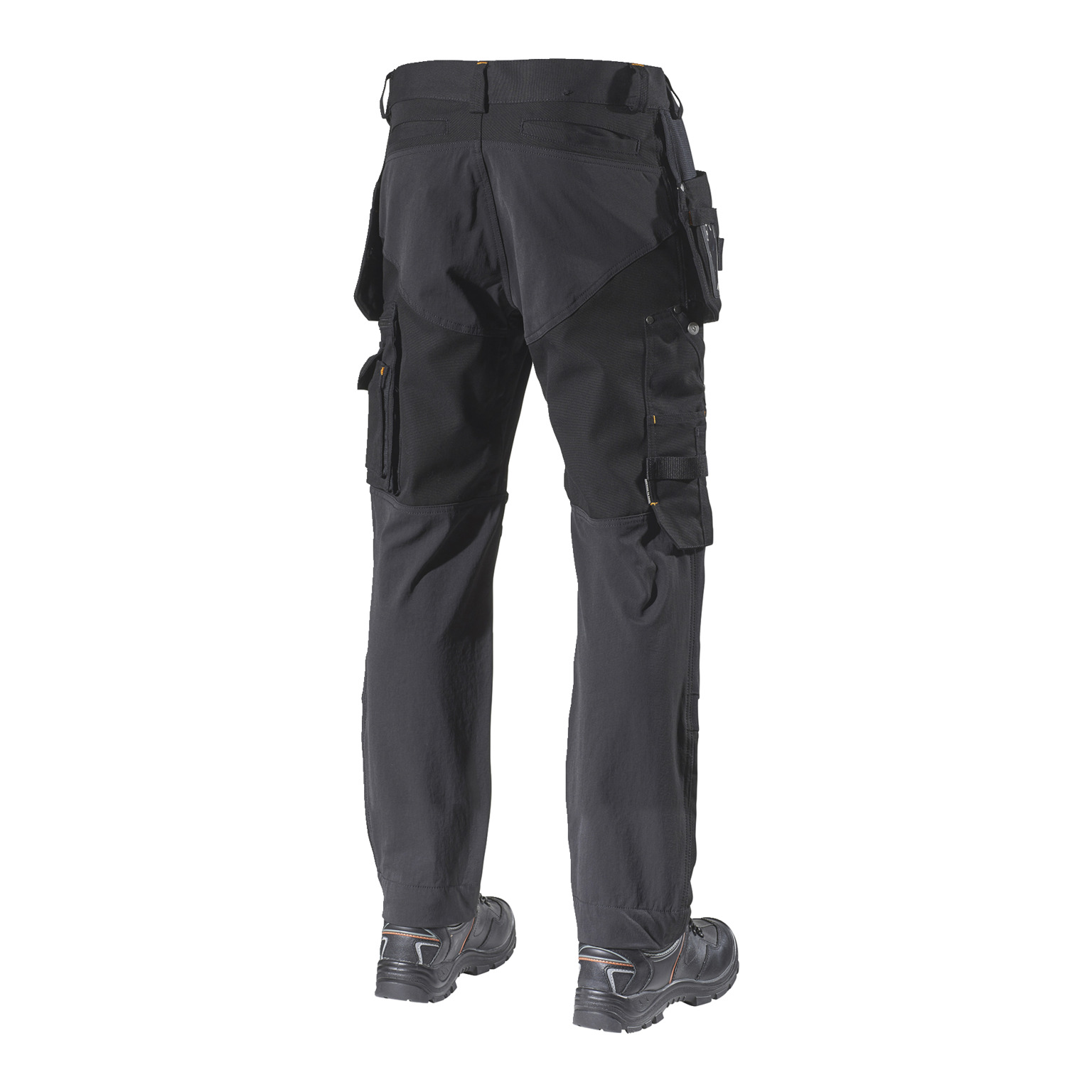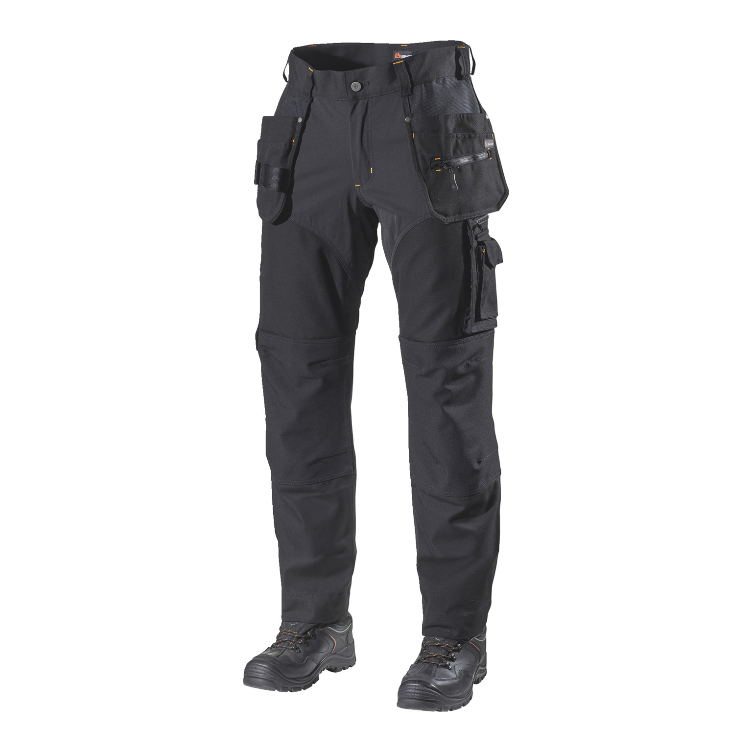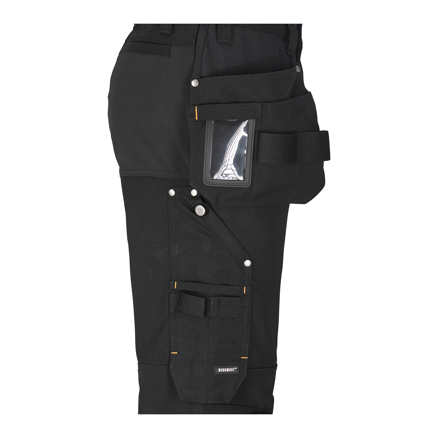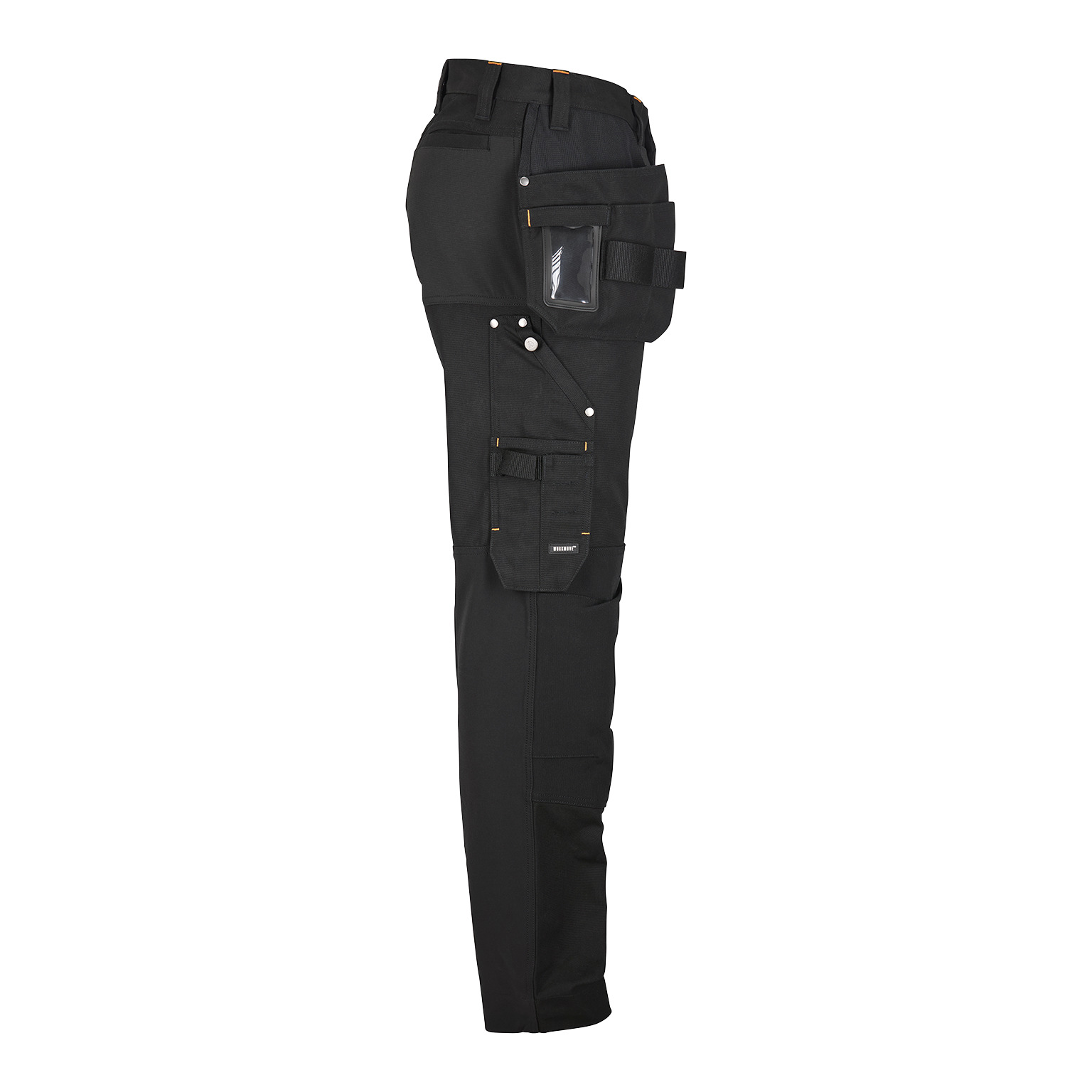 Två hängfickor med ID-korthållare på höger sida och två framfickor. Infällda stolpfickor bak. Knäskyddsficka i två höjder. Tumstocksficka. Benficka med dragkedja och invändig telefonficka och utvändig vinklad telefonficka försedd med magnetlås.