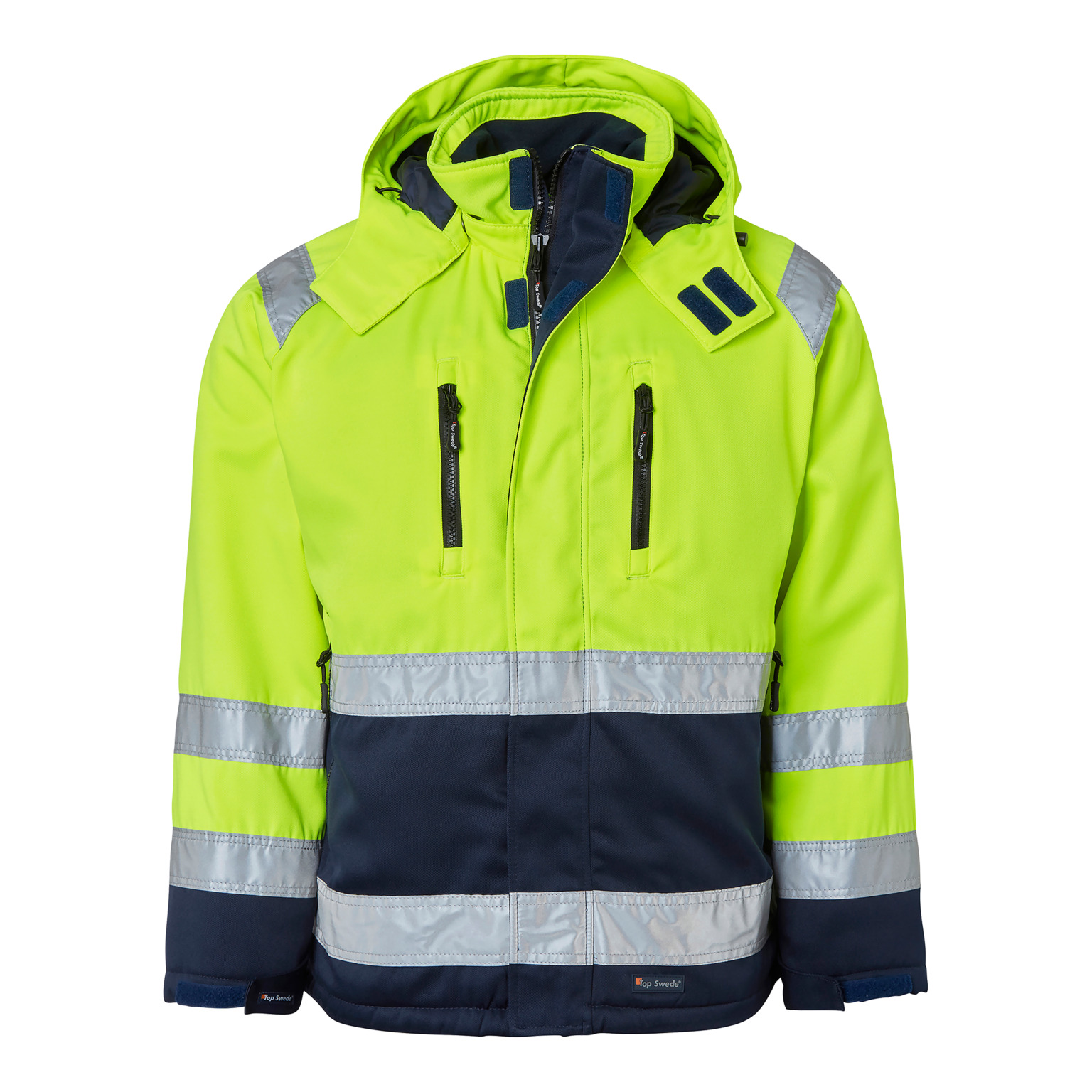 Ärmsluten har muddar och kan justeras med kardborreband för en bekväm passform, medan en dragsko i nederkanten ger ytterligare justeringsmöjligheter. Jackan är tillverkad av polyester, vilket ger både hållbarhet och komfort. Denna vinterjacka är designad för att möta de höga kraven från yrkesverksamma som behöver pålitliga och funktionella arbetskläder i olika arbetsmiljöer.