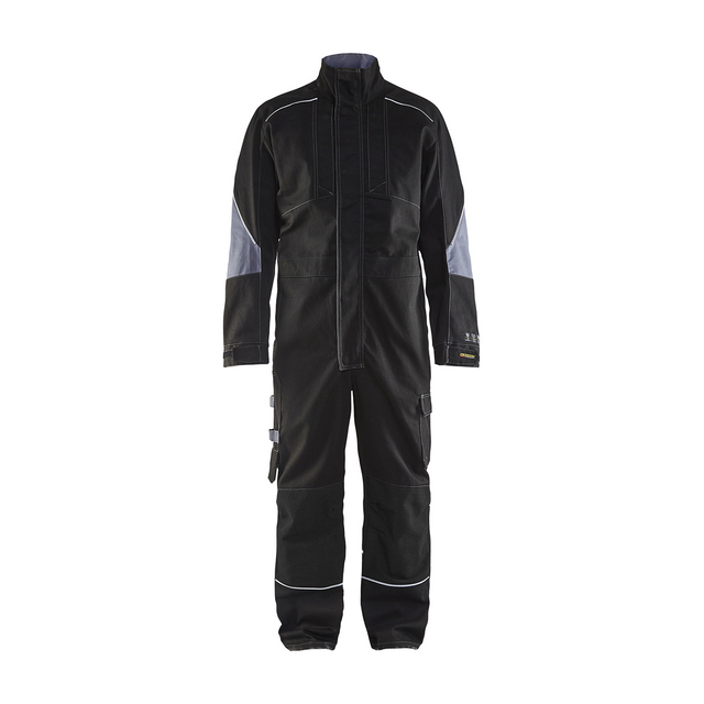 Flamoverall med praktiska fickor och dolt tvåvägsblixtlås i metall. Reflexdetaljer för ökad synlighet och bälg i rygg för bra komfort. Tål industritvätt.