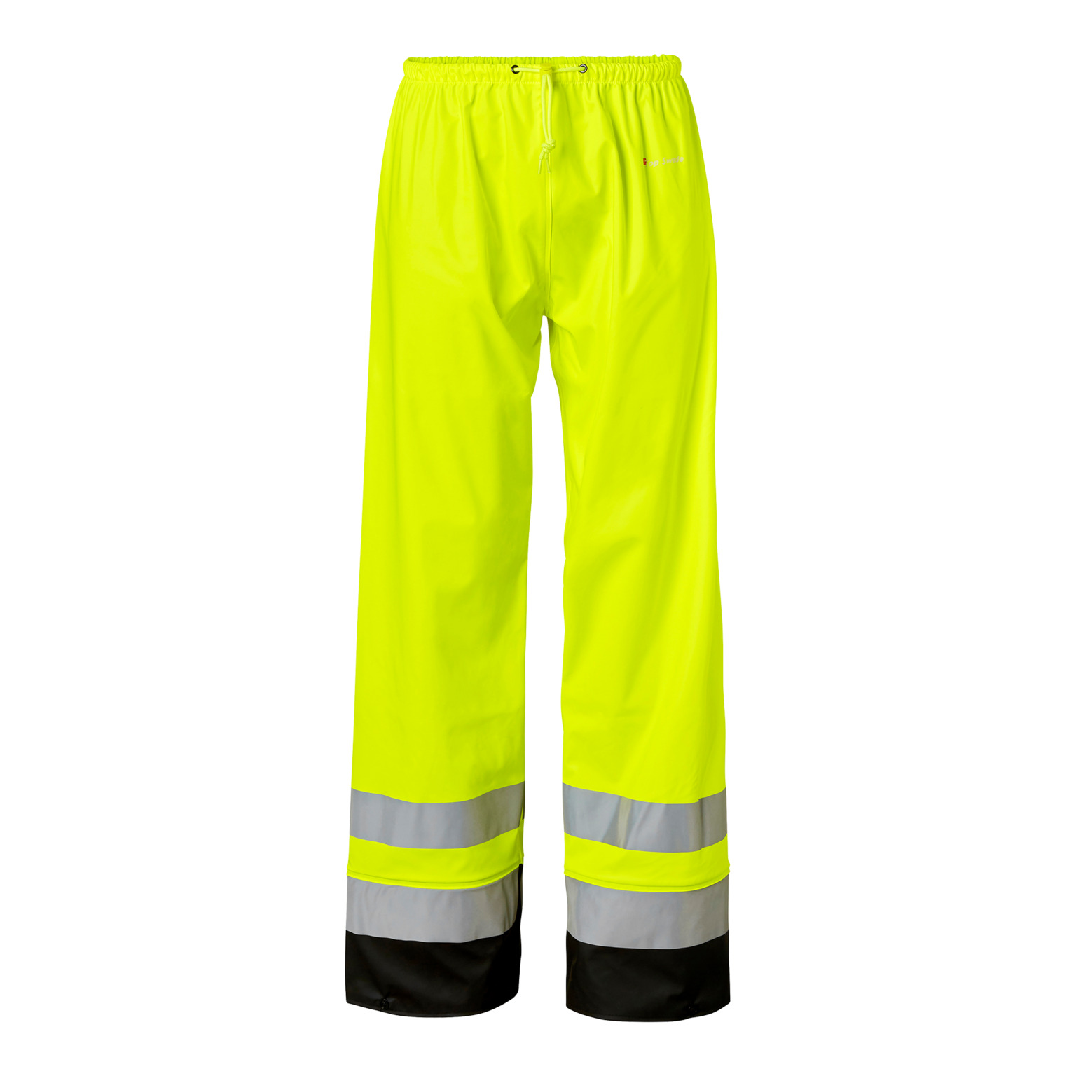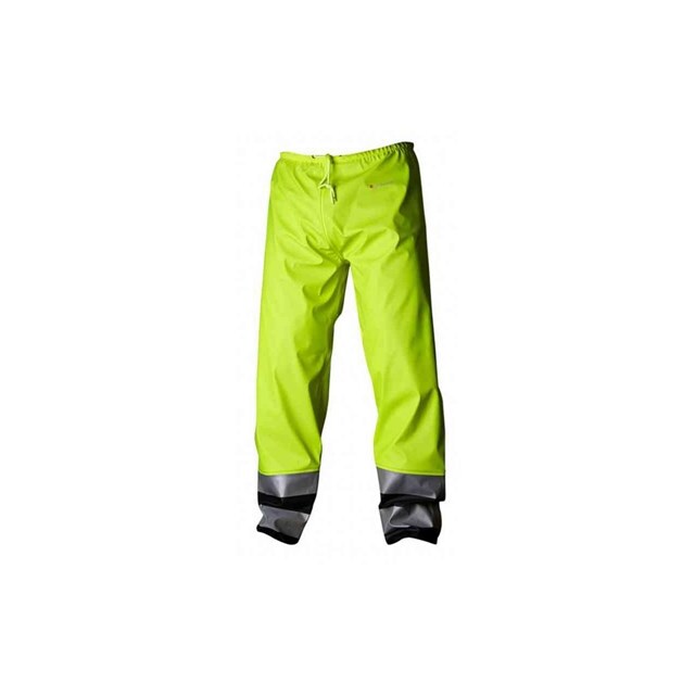 Regnmidjebyxa varsel. Resår och reglerbar snodd i midjan. Reglerbar knäppning vid fot. Svetsade sömmar. Material: Polyuretanbelagd stretch. Standard: EN ISO 20471 Klass 2. EN 343.