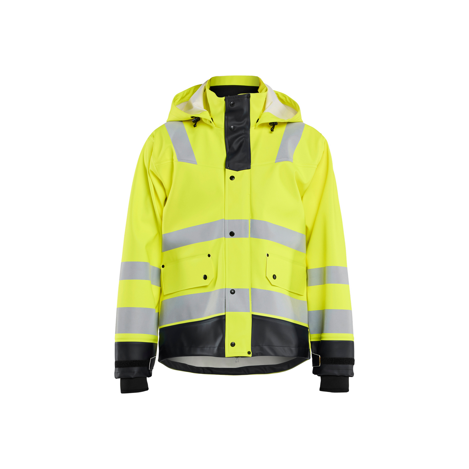 Styrka, smidighet och extremt bra skyddsfunktioner kännetecknar den här regnjackan i varsel. Den är vind- och vattentät i ett kraftigt material med svetsade sömmar samt försedd med en dold dragkedja med stormknäppning som effektivt håller vätan borta från kroppen. Den fleecefodrade kragen skyddar och värmer utan att skava mot huden. Justerbara ärmavslut med invändig neoprenmudd som stoppar vätan att tränga in när du arbetar. Certifierad enligt EN 343, klass 3,1, skyddskläder mot dåligt väder och EN ISO 20471, klass 3, skyddskläder med hög synbarhet.