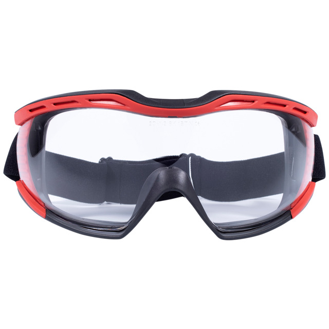 Skyddsglasögon med polykarbonatlins och ventilerad stomme. Mjuk tätningskant som sluter tätt och justerbart nackband. Skyddar mot vätska, damm och imma.