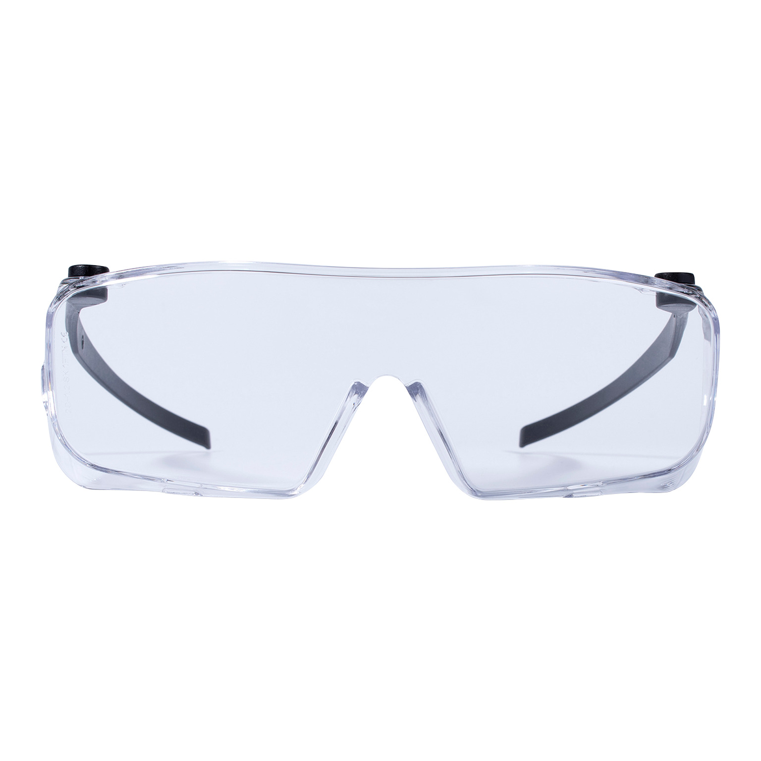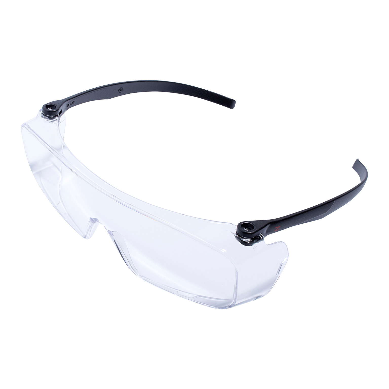Skyddsglasögon som används över slipade glasögon. Tunna, flexibla skalmar som är fästa på skyddsglasögats övre kant, en lösning som skapar mer utrymme för de slipade glasögonens skalmar.