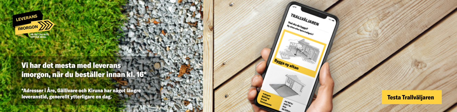 För göra valet av trall lättare för dig och hjälpa dig hitta rätt material till ditt trallprojekt kan du ta hjälp av vår Trallväljare. Den hjälper dig inte bara att välja och jämföra fördelarna mellan olika sorters trall, utan hjälper dig också att beräkna materialåtgången samt ge dig tips på hur du lägger trall. Trallväljaren ger dig även insikter om projektets omfattning och du kommer få en tydlig bild av kostnaden för trallen. Har du fler frågor finns Beijer Bygg alltid till hands, både online och i butik, för att ge råd och stöd. På så sätt blir det enkelt för dig att välja rätt trallvirke och planera ditt bygge på bästa sätt.